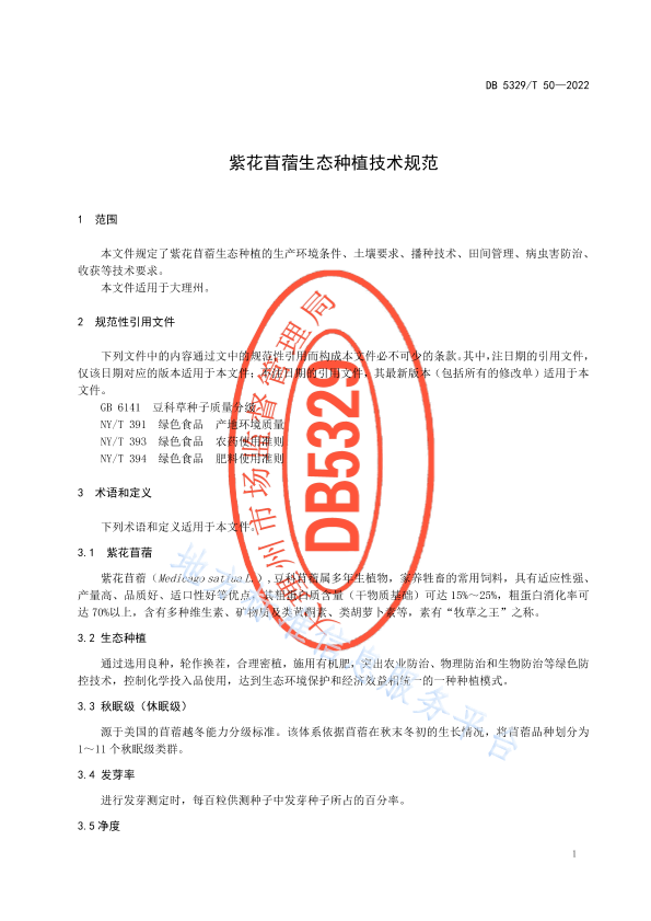 本文件规定了紫花苜蓿生态种植的生产环境条件、土壤要求、播种技术、田间管理、病虫害防治、收获等技术要求。 本文件适用于大理州。
