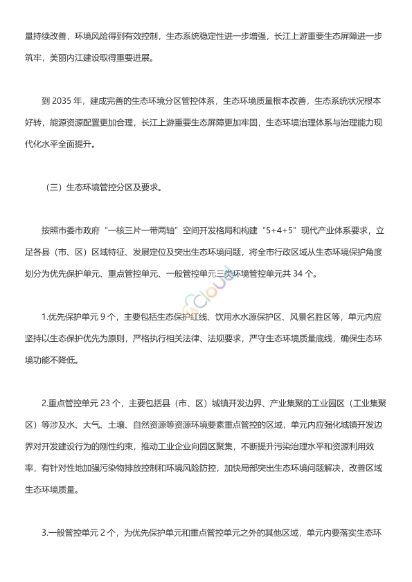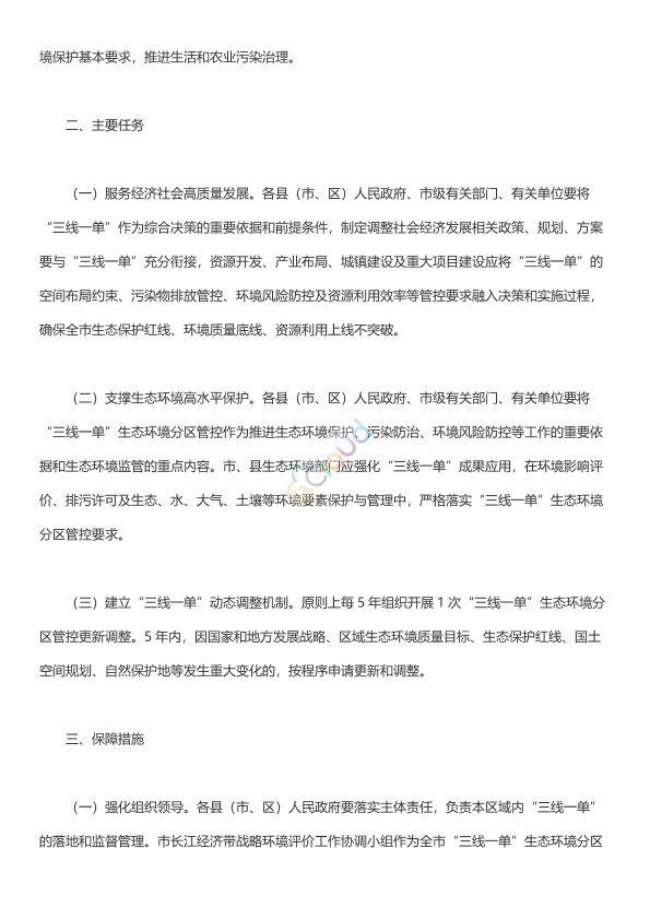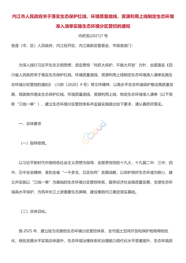 各县(市、区)人民政府,内江经开区、内江高新区管委会,市级各部门: 为深入践行习近平生态文明思想,坚定贯彻“共抓大保护、不搞大开发”方针,全面落实《四川省人民政府关于落实生态保护红线、环境质量底线、资源利用上线制定生态环境准入清单实施生态环境分区管控的通知》(川府〔2020〕9号)等文件精神,以高水平生态环境保护推动高质量发展,现就我市落实生态保护红线、环境质量底线、资源利用上线,制定生态环境准入清单(以下简称“三线一单”),建立生态环境分区管控体系并监督实施提出如下要求,请认真抓好落实。