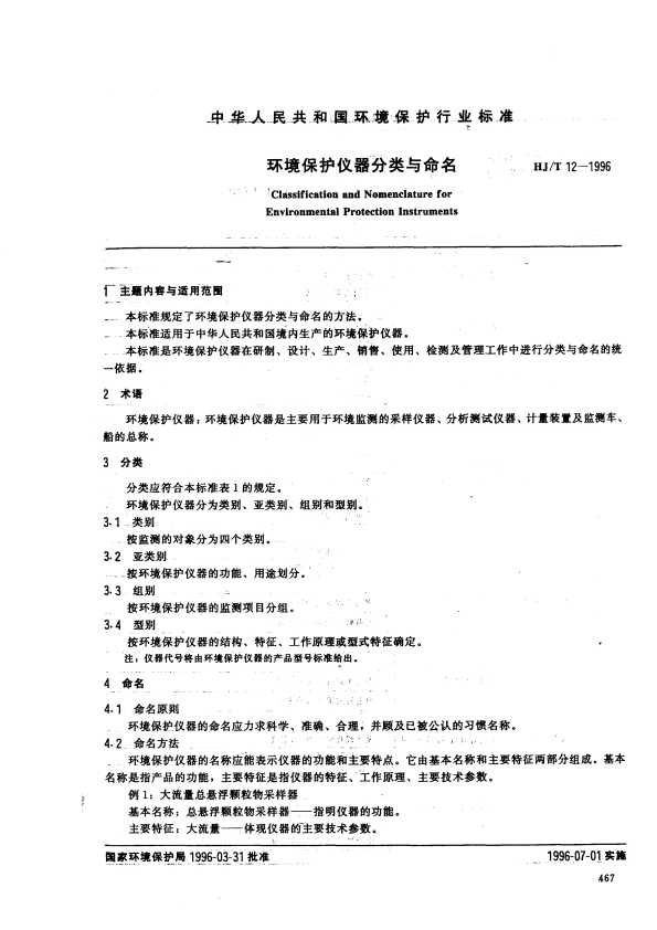 本标准规定了环境保护仪器分类与命名的方法。 本标准适用于中华人民共和国境内生产的环境葆护仪器。 本标准是环境保护仪器在研制、设计、生产、销售、使用、检测及管理工作中进行分类与命名的统一依据。