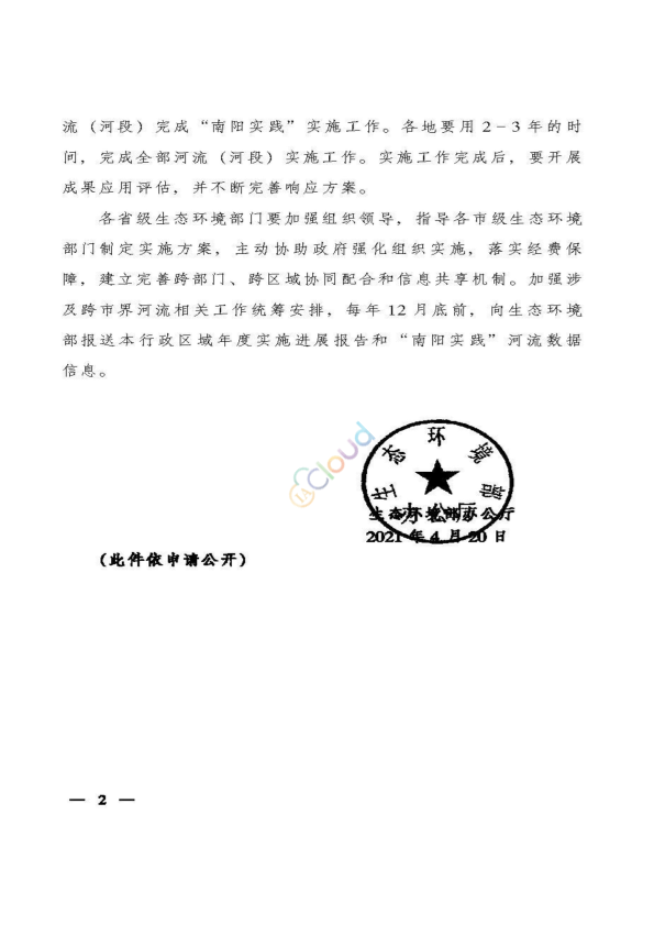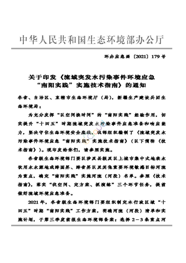各案、自治区、直辖市生态环境厅(局),新疆生产建设兵团生态环境局; 为充分发挥“以空间换时间”的“南阳实贵”经验作用,切实提升“十四五”时期流域突发水污染事件应急准备和响应能力,坚决守住生态环境安全底线,我部组织编制了《流域突发水污染事件环境应急“南阳实践”实施技术指南》(以下简称《技术指南》)。现印发给你们,请参照实施。