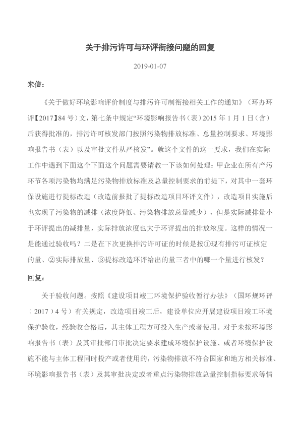 来信: 《关于做好环境影响评价制度与排污许可制衔接相关工作的通知》(环办环评【2017】84号)文,第七条中规定“环境影响报告书(表)2015年1月1日(含)后获得批准的,排污许可核发部门按照污染物排放标准、总量控制要求、环境影响报告书(表)以及审批文件从严核发”。就这个文件的这一要求,我们在实际工作中遇到下面这个下面这个问题需要请教一下该如何处理:甲企业在所有产污环节各项污染物均满足污染物排放标准及总量控制要求的前提下,对其中一套环保设施进行提标改造(改造前报批了提标改造项目环评文件),改造项目实施后也实现了污染物的减排(浓度降低、污染物排放总量减少),但是实际减排量小于环评提出的减排量,实际排放浓度也大于环评提出的排放浓度。这样的情况一是能通过验收吗?二是在下次更换排污许可证的时候是按①现有排污可证核定的量、②实际排放量、③提标改造环评给出的量三者中的哪一个量进行核发?