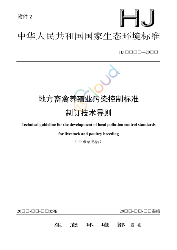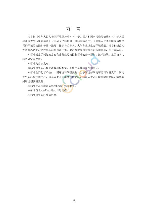 为贯彻《中华人民共和国环境保护法》《中华人民共和国水污染防治法》《中华人民共和国大气污染防治法》《中华人民共和国土壤污染防治法》《中华人民共和国固体废物污染环境防治法》等法律法规,保护和改善水、大气和土壤生态环境质量,指导和规范地方畜禽养殖业污染控制标准制修订工作,促进畜禽养殖业绿色可持续发展,制订本标准。 本标准规定了制订地方畜禽养殖业污染控制标准的基本原则、技术路线、主要技术内容的确定等要求。 本标准为首次发布。 本标准由生态环境部法规与标准司、土壤生态环境司组织制订。 本标准主要起草单位:中国环境科学研究院、生态环境部华南环境科学研究所、河南省生态环境技术中心、山东省生态环境规划研究院、云南省生态环境科学研究院、清华苏州环境创新研究院。 本标准生态环境部 2□□□年□□月□□日批准。 本标准自 2□□□年□□月□□日起实施。 本标准由生态环境部解释。