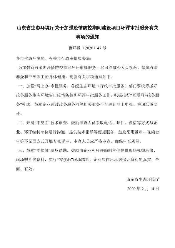 各市生态环境局、有关市行政审批服务局: 为加强新冠肺炎疫情防控期间环评审批服务,尽可能减少人员接触,保障办事群众和干部职工的身体健康,现就有关事项通知如下: