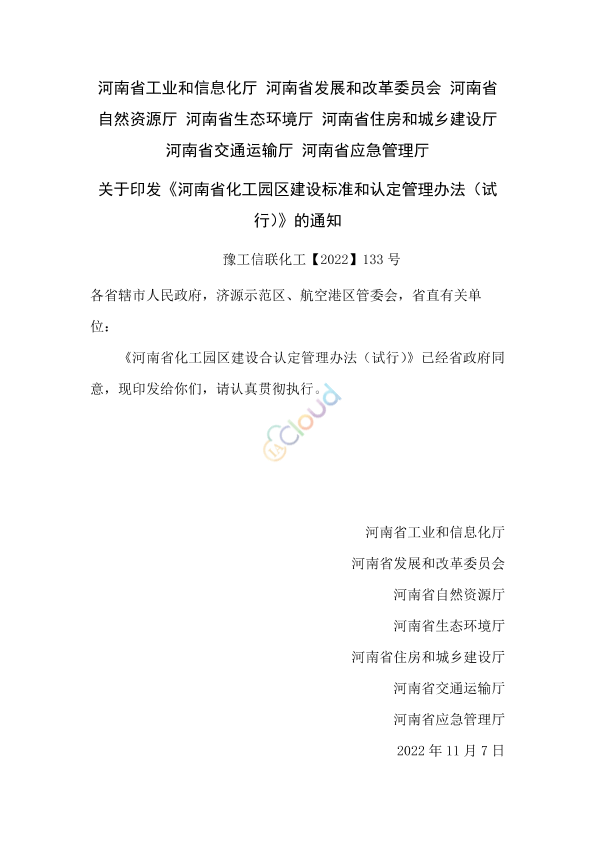 各省辖市人民政府,济源示范区、航空港区管委会,省直有关单位: 《河南省化工园区建设合认定管理办法(试行)》已经省政府同意,现印发给你们,请认真贯彻执行。 河南省工业和信息化厅 河南省发展和改革委员会 河南省自然资源厅 河南省生态环境厅 河南省住房和城乡建设厅 河南省交通运输厅 河南省应急管理厅 2022年11月7日