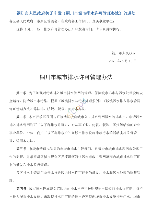 铜川市人民政府关于印发《铜川市城市排水许可管理办法》的通知.pdf