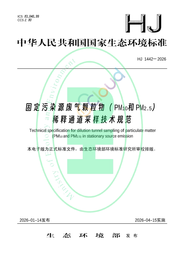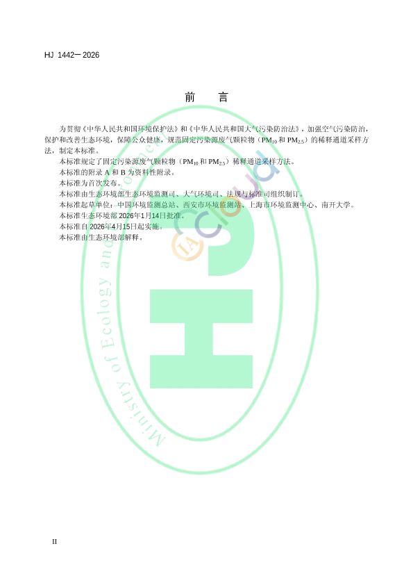 为贯彻《中华人民共和国环境保护法》和《中华人民共和国大气污染防治法》,加强空气污染防治,保护和改善生态环境,保障公众健康,规范固定污染源废气颗粒物(PM10和PM2.5)的稀释通道采样方法,制定本标准。