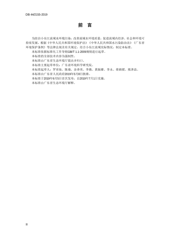 为防治小东江流域水环境污染,改善流域水环境质量,促进流域内经济、社会和环境可持续发展,根据《中华人民共和国环境保护法》《中华人民共和国水污染防治法》《广东省 环境保护条例》等法律法规及有关规定,结合小东江流域实际情况,制定本标准。 本标准依据标准化工作导则GB/T1.1-2009规则进行起草。 本标准的全部技术内容为强制性。 本标准由广东省生态环境厅提出并归口。 本标准主要起草单位:广东省环境科学研究院。 本标准起草人:罗育池、陈瑜、余香英、李燕、黄振雄、李永、蒋婧媛、熊津晶。 本标准由广东省人民政府2019年5月8日批准。 本标准于2019年6月5日首次发布,自2019年7月1日实施。 本标准由广东省生态环境厅解释。