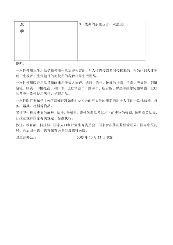 各省、自治区、直辖市卫生厅局、环境保护局,新疆生产建设兵团卫生局、环境保护局: 根据《医疗废物管理条例》,卫生部和国家环境保护总局制定了《医疗废物分类目录》。现印发给你们,请遵照执行。 附件:医疗废物分类目录 二〇〇三年十月十日