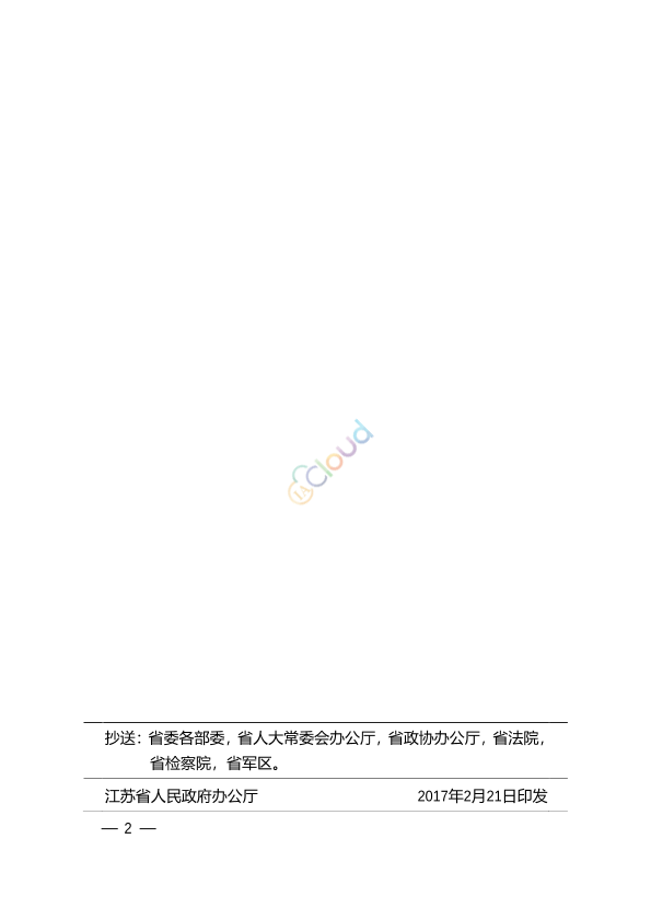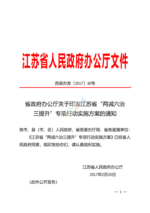 各市、县(市、区)人民政府,省各委办厅局,省各直属单位: 《江苏省“两减六治三提升”专项行动实施方案》已经省人民政府同意,现印发给你们,请认真组织实施。 江苏省人民政府办公厅 2017年2月20日