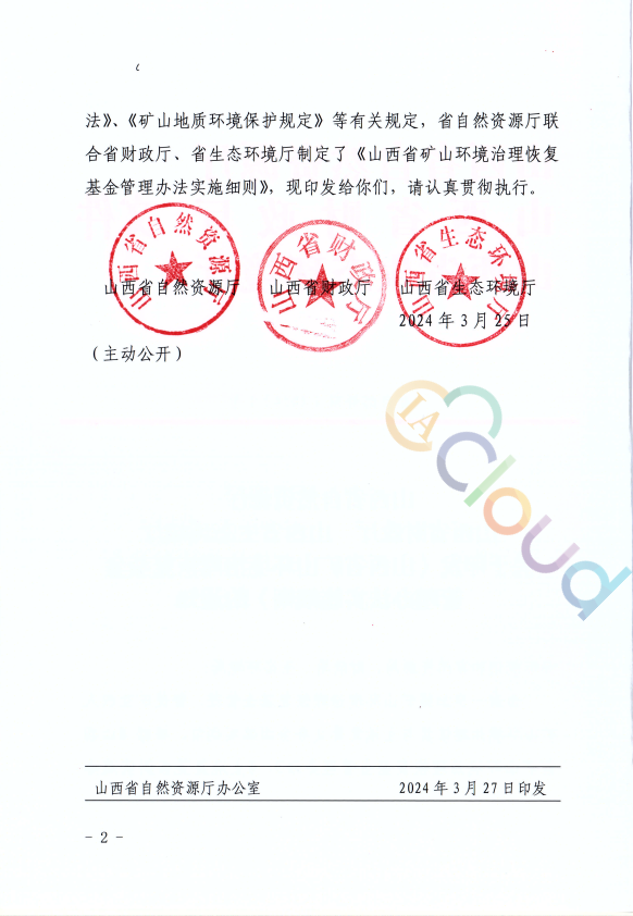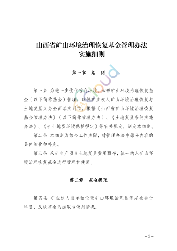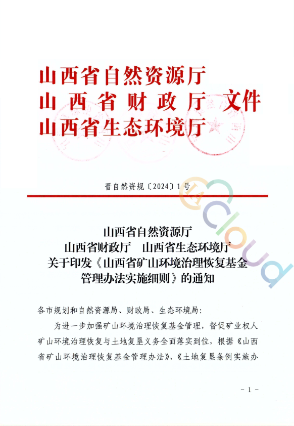 各市规划和自然资源局、财政局、生态环境局: 为进一步加强矿山环境治理恢复基金管理,督促矿业权人矿山环境治理恢复与土地复垦义务全面落实到位,根据《山西省矿山环境治理恢复基金管理办法》《土地复垦条例实施办法》《矿山地质环境保护规定》等有关规定,省自然资源厅联合省财政厅、省生态环境厅制定了《山西省矿山环境治理恢复基金管理办法实施细则》,现印发给你们,请认真贯彻执行。 山西省自然资源厅 山西省财政厅 山西省生态环境厅 2024年3月25日 (此件主动公开)