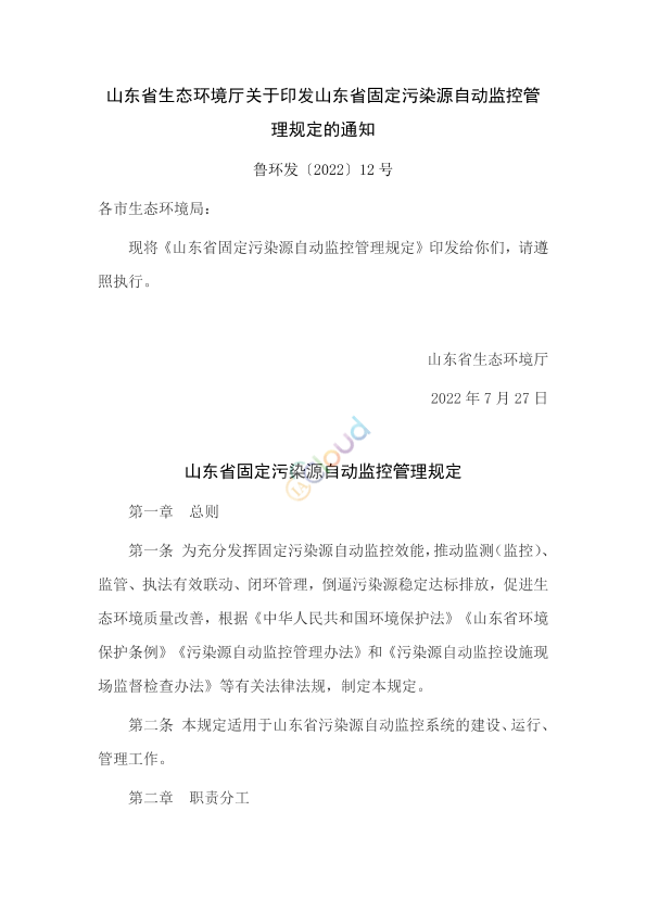 各市生态环境局: 现将《山东省固定污染源自动监控管理规定》印发给你们,请遵照执行。 山东省生态环境厅 2022年7月27日