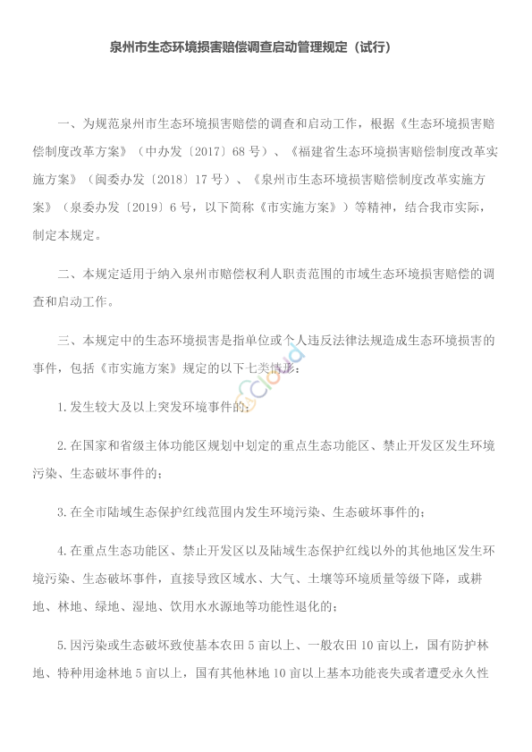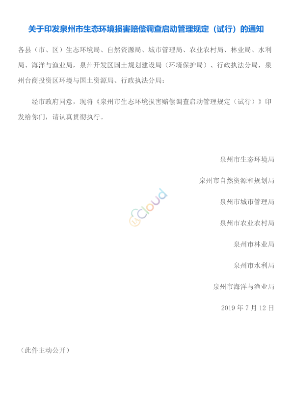 各县(市、区)生态环境局、自然资源局、城市管理局、农业农村局、林业局、水利局、海洋与渔业局,泉州开发区国土规划建设局(环境保护局)、行政执法分局,泉州台商投资区环境与国土资源局、行政执法分局: 经市政府同意,现将《泉州市生态环境损害赔偿调查启动管理规定(试行)》印发给你们,请认真贯彻执行。 泉州市生态环境局 泉州市自然资源和规划局 泉州市城市管理局 泉州市农业农村局 泉州市林业局 泉州市水利局 泉州市海洋与渔业局 2019年7月12日