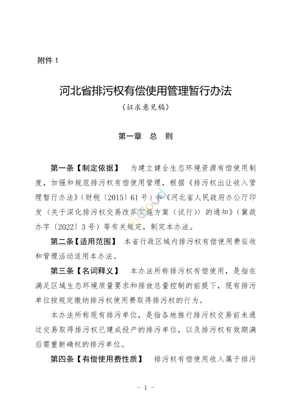 为推进深化排污权交易改革,建立健全排污权有偿使用制度,我厅研究起草了《河北省排污权有偿使用管理暂行办法》(详见附件),现公开征求意见。 各机关团体、企事业单位和个人均可提出意见和建议。有关意见请于2022年12月10日前书面反馈我厅(电子文档请发至邮箱) 感谢支持。 联 系 人:河北省生态环境厅综合处 苗建格 河北省污染物排放权交易服务中心 刘增强 联系电话:0311-87803701 0311-85202680 邮 箱:paiwuquan@126.com 附件1:河北省排污权有偿使用管理暂行办法(征求意见稿).docx 附件2:《河北省排污权有偿使用管理暂行办法》的起草说明.docx 河北省生态环境厅 2022年11月6日