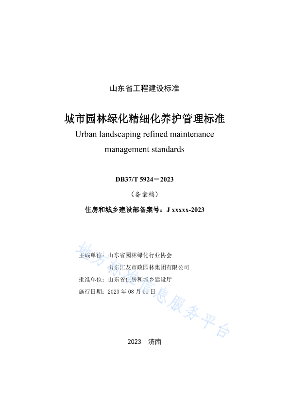 根据山东省住房和城乡建设厅、山东省市场监督管理局《关于印发2021年山东省工程建设标准制修订计划的通知》(鲁建标字(2021)19号)的要求,标准编制组经广泛调查研究,认真总结实践经验,参考有关国家标准和行业标准,在充分征求意见的基础上,制定本标准。 本标准的主要技术内容是: 1.总则; 2. 术语; 3. 基本规定; 4.植物精细化养护; 5. 其他养护措施; 6. 智慧荞护; 7. 绿地精细化管理。. 本标准由山东省住房和城乡建设厅负责管理,由山东省园林绿化行业协会、山东汇友市政园林集团有限公司负责具体内容的解释。执行过程中如有意见或建议,请寄送山东省园林绿化行业协会(地址:山东省济南市市中区经五小纬四路46-1号2层218室,邮编: 250000, 邮箱: sdsfjyIxh@126. com) 本标准主编单位: . 山东省园林绿化行业协会 山东汇友市政园林集团有限公司 本标准参编单位: 山东道正建设集团有限公司 山东建筑大学设计集团有限公司 济南城市建设集团有限公司 本标准主要起草人员:吴雯雯 张永亮 王琳琳 柏荥号 宋姝瑶 董勇男 冯继军 孙金亭 李湛王红磊 闫吉祥 彭建龙 倪守增 杨欣 王小翌 李文君 旲娟 孙景鑫 王向南 刘晓茉 宋英杰 旲冠仑 扈广利 董先超 许存军 本标准主要审查人员:安吉磊 李成 王维霞 张秀华 肖鹏 陈朝霞 曾全银 杨守国 张薇薇