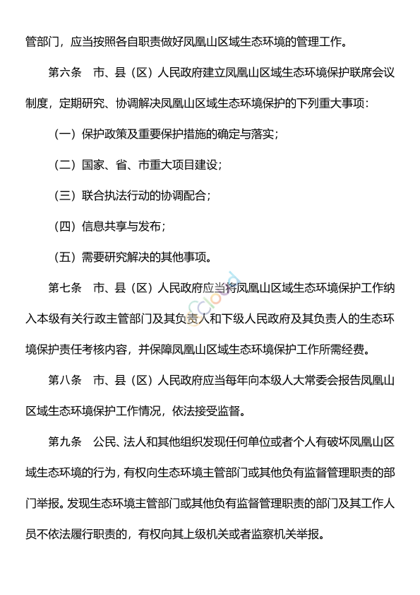 (2020年8月24日潮州市第十五届人民代表大会常务委员会第三十二次会议通过 2020年9月29广东省第十三届人民代表大会常务委员会第二十五次会议批准) 为了加强凤凰山区域生态环境的保护,促进生态文明建设,实现经济社会可持续发展,根据《中华人民共和国环境保护法》《中华人民共和国森林法》《中华人民共和国农业法》等有关法律、法规的规定,结合本市实际,制定本条例。