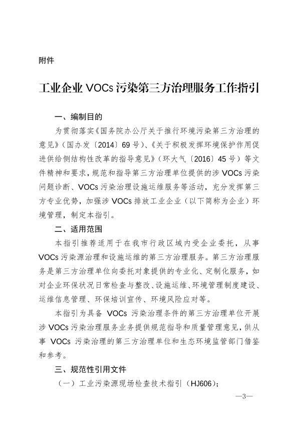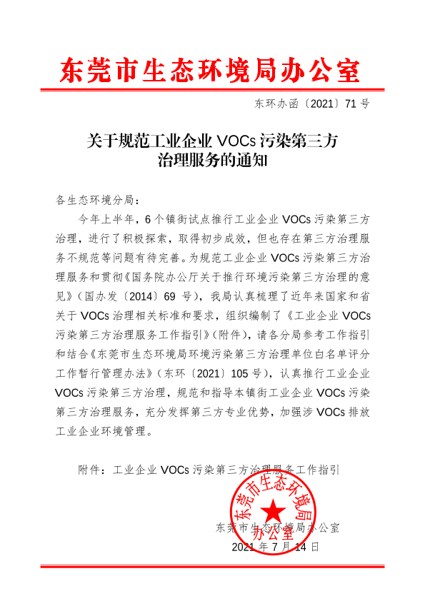 各生态环境分局: 今年上半年,6个镇街试点推行工业企业VOCs污染第三方治理,进行了积极探索,取得初步成效,但也存在第三方治理服务不规范等问题有待完善。为规范工业企业VOCs污染第三方治理服务和贯彻《国务院办公厅关于推行环境污染第三方治理的意见》(国办发〔2014〕69号),我局认真梳理了近年来国家和省关于VOCs治理相关标准和要求,组织编制了《工业企业VOCs污染第三方治理服务工作指引》(附件),请各分局参考工作指引和结合《东莞市生态环境局环境污染第三方治理单位白名单评分工作暂行管理办法》(东环〔2021〕105号),认真推行工业企业VOCs污染第三方治理,规范和指导本镇街工业企业VOCs污染第三方治理服务,充分发挥第三方专业优势,加强涉VOCs排放工业企业环境管理。 附件:工业企业VOCs污染第三方治理服务工作指引 东莞市生态环境局办公室 2021年7月14日