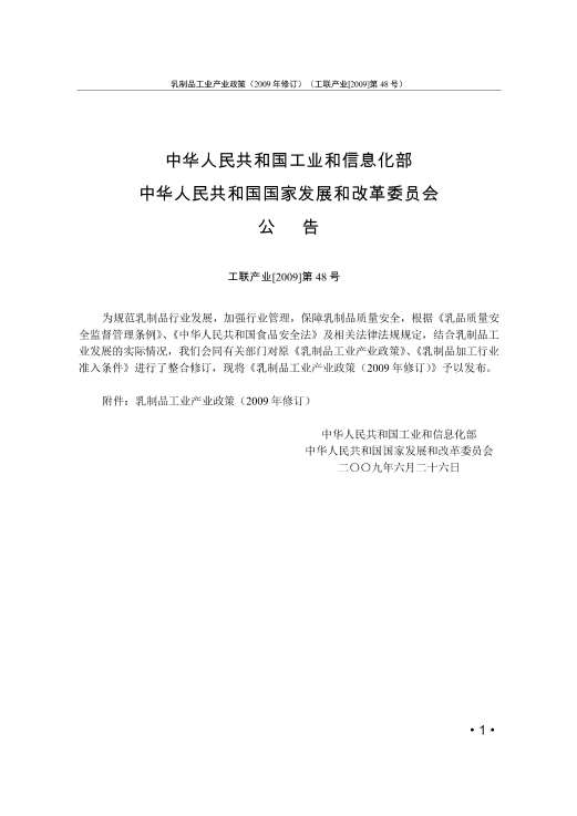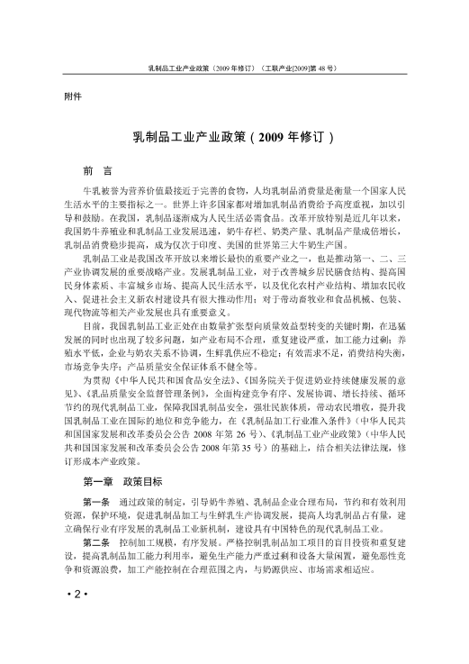 为规范乳制品行业发展,加强行业管理,保障乳制品质量安全,根据《乳品质量安全监督管理条例》、《中华人民共和国食品安全法》及相关法律法规规定,结合乳制品工业发展的实际情况,我们会同有关部门对原《乳制品工业产业政策》、《乳制品加工行业准入条件》进行了整合修订,现将《乳制品工业产业政策(2009年修订)》予以发布。 附件:乳制品工业产业政策(2009年修订) 中华人民共和国工业和信息化部 中华人民共和国国家发展和改革委员会 二〇〇九年六月二十六日