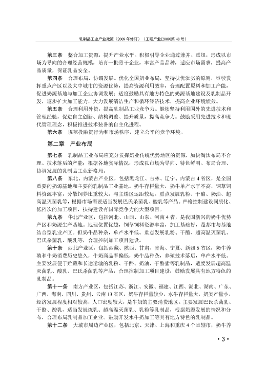 前 言 牛乳被誉为营养价值最接近于完善的食物,人均乳制品消费量是衡量一个国家人民生活水平的主要指标之一。世界上许多国家都对增加乳制品消费给予高度重视,加以引导和鼓励。在我国,乳制品逐渐成为人民生活必需食品。改革开放特别是近几年以来,我国奶牛养殖业和乳制品工业发展迅速,奶牛存栏、奶类产量、乳制品产量成倍增长,乳制品消费稳步提高,成为仅次于印度、美国的世界第三大牛奶生产国。 乳制品工业是我国改革开放以来增长最快的重要产业之一,也是推动第一、二、三产业协调发展的重要战略产业。发展乳制品工业,对于改善城乡居民膳食结构、提高国民身体素质、丰富城乡市场、提高人民生活水平,以及优化农村产业结构、增加农民收入、促进社会主义新农村建设具有很大推动作用;对于带动畜牧业和食品机械、包装、现代物流等相关产业发展也具有重要意义。 目前,我国乳制品工业正处在由数量扩张型向质量效益型转变的关键时期,在迅猛发展的同时也出现了较多问题,如产业布局不合理,重复建设严重,加工能力过剩;养殖水平低,企业与奶农关系不协调,生鲜乳供应不稳定;有效需求不足,消费结构失衡,市场竞争失序;产品质量安全保证体系不健全等。 为贯彻《中华人民共和国食品安全法》、《国务院关于促进奶业持续健康发展的意见》、《乳品质量安全监督管理条例》,全面构建竞争有序、发展协调、增长持续、循环节约的现代乳制品工业,保障我国乳制品安全,强壮民族体质,带动农民增收,提升我国乳制品工业在国际的地位和竞争能力,在《乳制品加工行业准入条件》(中华人民共和国国家发展和改革委员会公告2008年第26号)、《乳制品工业产业政策》(中华人民共和国国家发展和改革委员会公告2008年第35号)的基础上,结合相关法律法规,修订形成本产业政策。 第一章 政策目标 第一条 通过政策的制定,引导奶牛养殖、乳制品企业合理布局,节约和有效利用资源,保护环境,促进乳制品加工与生鲜乳生产协调发展,提高人均乳制品占有量,建立确保行业有序发展的乳制品工业新机制,建设具有中国特色的现代乳制品工业。 第二条 控制加工规模,有序发展。严格控制乳制品加工项目的盲目投资和重复建设,提高乳制品加工能力利用率,避免生产能力严重过剩和设备大量闲置,避免恶性竞争和资源浪费,加工产能控制在合理范围之内,与奶源供应、市场需求相适应。 第三条 整合加工资源,提升产业水平。积极引导企业通过兼并、重组,形成以市场为导向的合理经营规模,培育一批骨干企业,丰富产品品种,适应市场需求,提高产品质量,保证乳品安全。 第四条 合理布局,协调发展。优化全国奶业布局,坚持扶优汰劣的原则,继续发挥重点产区以及大中城市的资源优势,提高资源利用效率,合理配置原料和加工产能,促进奶源基地与加工企业协调发展;适度鼓励具有地方特色的奶源基地建设及乳制品开发,逐步扩大加工能力,大力发展清洁生产和循环经济技术,提高企业环境绩效。 第五条 合理利用外资,提高乳制品工业竞争力。继续坚持利用国外的先进技术和管理经验,促进自主创新、结构调整、提升质量,提高竞争力。鼓励采用先进技术和现代管理理念,积极推进技术装备的自主化进程。 第六条 规范投融资行为和市场秩序,建立公平的竞争环境。 第二章 产业布局 第七条 乳制品工业布局应充分发挥奶业传统优势地区的资源,加快淘汰布局不合理、技术落后的产能;根据各地实际情况,形成以市场为导向、特色鲜明、布局合理、协调发展的乳制品工业新格局。 第八条 东北、内蒙古产业区,包括黑龙江、吉林、辽宁、内蒙古4省区,是全国重要的奶源基地和主要的乳制品工业基地。奶牛存栏量大,奶牛单产水平不高,饲草饲料资源丰富,分散饲养比重较大,与主销区运距较远。重点发展乳粉、干酪、奶油、超高温灭菌乳等,根据市场需要适当发展巴氏杀菌乳、酸乳等产品。严格控制建设同质化、低档次的加工项目,扶持建设有国际竞争力的大型项目。 第九条 华北产业区,包括河北、山西、山东、河南4省,是我国新兴的奶牛优势产区和奶源生产基地。地理位置优越,饲草饲料资源丰富,加工基础好,是都市与基地结合型乳业产区。但奶牛品种杂,单产水平低。重点发展乳粉、干酪、超高温灭菌乳、巴氏杀菌乳、酸乳等,合理控制加工项目建设。 第十条 西北产业区,包括西藏、陕西、甘肃、青海、宁夏、新疆6省区,奶牛养殖和牛奶消费历史悠久,牛奶商品率偏低,奶牛品种杂,养殖技术落后,单产水平低。主要发展便于贮藏和长途运输的乳粉、干酪、奶油、干酪素等乳制品,适度发展超高温灭菌乳、酸乳、巴氏杀菌乳等产品,合理控制加工项目建设,鼓励发展具有地方特色的乳制品。 第十一条 南方产业区,包括江苏、浙江、安徽、福建、江西、湖北、湖南、广东、广西、海南、四川、贵州、云南13省区,奶牛存栏量较少,水牛存栏量大,奶类产量小,经济发展程度相对较高,人口密度较大,是牛奶的主要消费地区。主要发展巴氏杀菌乳、干酪、酸乳,适当发展炼乳、超高温灭菌乳、乳粉等乳制品,根据奶源发展的情况和分布,合理布局乳制品加工企业。鼓励开发水牛奶加工等具有地方特色的乳制品。 第十二条 大城市周边产业区,包括北京、天津、上海和重庆4