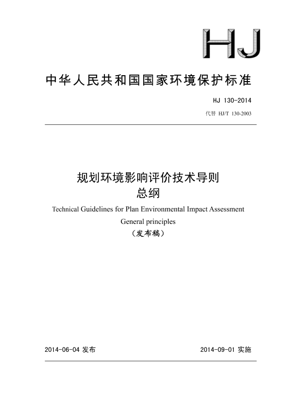 为贯彻《中华人民共和国环境保护法》、《中华人民共和国环境影响评价法》、《规划环境影响评价条例》,规范和指导规划环境影响评价工作,从决策源头预防环境污染和生态破坏,促进经济、社会和环境的全面协调可持续发展,制定本标准。 本标准规定了规划环境影响评价的一般性原则、内容、工作程序、方法和要求。 本标准是对《规划环境影响评价技术导则(试行)》(HJ/T 130-2003)的修订,与原标准相比,主要修改内容如下: --增加了术语和定义,明确了规划环境影响评价技术导则体系构成。 --修改了评价目的、评价原则、评价范围和评价工作流程等内容,将早期介入原则调整为全程互动原则,增加了层次性原则,修改了一致性、整体性、科学性等评价原则。 --在规划分析章节增加了规划不确定性分析的内容和要求。 --在环境现状调查与评价章节细化了现状调查与评价的内容和要求,增加了环境影响回顾性评价的内容和要求。 --对环境影响识别与评价指标体系构建章节进行了调整,修改了环境影响识别的内容,规定了评价指标体系构建的方法和指标值确定的要求,增加了重大不良环境影响的判定原则。 --修改了环境影响预测与评价的内容、方法和要求,增加了规划开发强度分析,不同规划发展情景的预测,对生态系统完整性的影响预测与评价,资源与环境承载力评估等内容。提出了进行人群健康影响状况分析,事故性环境风险预测与评价和生态风险评价,以及清洁生产水平和循环经济分析的要求。 --增加了规划方案综合论证和优化调整建议章节,提出了环境合理性论证和可持续发展论证的内容、方法和要求,明确了不同类型规划的论证重点,明确了规划优化调整的原则、内容和要求。 --修改了环境影响减缓措施的内容和要求,增加了对规划包含的具体建设项目提出评价要求的内容。 --在附录中,调整并增加了规划环境影响评价方法,补充了各种方法的应用示例。 本标准于2003年首次发布,本次为第一次修订。 自本标准实施之日起,《规划环境影响评价技术导则(试行)》(HJ/T 130-2003)废止。 本标准的附录A为资料性附录。 本标准由环境保护部会同国务院有关部门组织制订。 本标准主要起草单位:环境保护部环境工程评估中心、复旦大学。 本标准环境保护部2014年6月4日批准。 本标准自2014年9月1日起实施。 本标准由环境保护部解释。