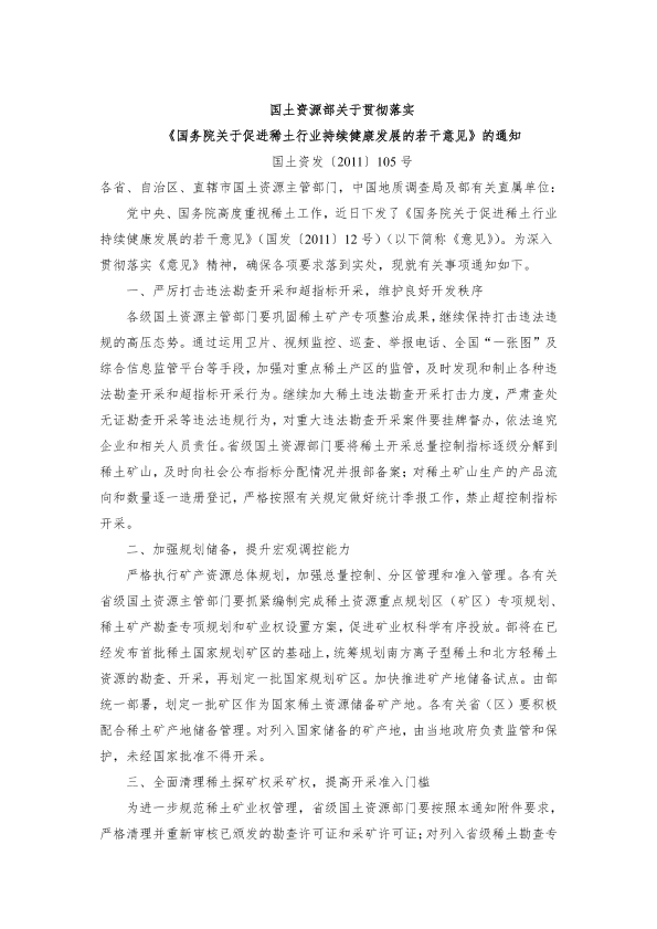 国土资源部关于贯彻落实 《国务院关于促进稀土行业持续健康发展的若干意见》的通知 国土资发〔2011〕105号 各省、自治区、直辖市国土资源主管部门,中国地质调查局及部有关直属单位: 党中央、国务院高度重视稀土工作,近日下发了《国务院关于促进稀土行业持续健康发展的若干意见》(国发〔2011〕12号)(以下简称《意见》)。