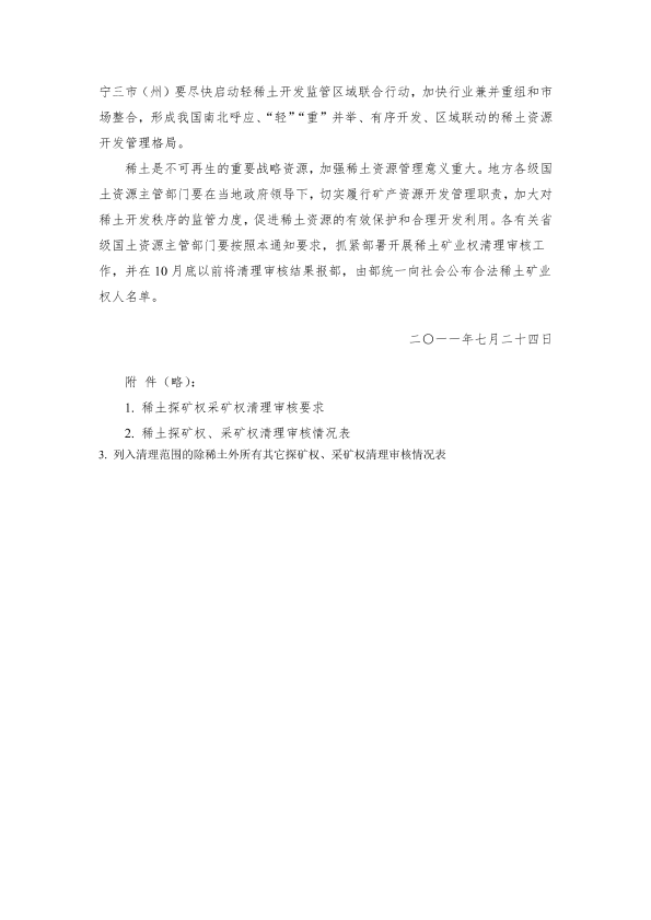 国土资源部关于贯彻落实 《国务院关于促进稀土行业持续健康发展的若干意见》的通知 国土资发〔2011〕105号 各省、自治区、直辖市国土资源主管部门,中国地质调查局及部有关直属单位: 党中央、国务院高度重视稀土工作,近日下发了《国务院关于促进稀土行业持续健康发展的若干意见》(国发〔2011〕12号)(以下简称《意见》)。为深入贯彻落实《意见》精神,确保各项要求落到实处,现就有关事项通知如下。 一、严厉打击违法勘查开采和超指标开采,维护良好开发秩序 各级国土资源主管部门要巩固稀土矿产专项整治成果,继续保持打击违法违规的高压态势。通过运用卫片、视频监控、巡查、举报电话、全国“一张图”及综合信息监管平台等手段,加强对重点稀土产区的监管,及时发现和制止各种违法勘查开采和超指标开采行为。继续加大稀土违法勘查开采打击力度,严肃查处无证勘查开采等违法违规行为,对重大违法勘查开采案件要挂牌督办,依法追究企业和相关人员责任。省级国土资源部门要将稀土开采总量控制指标逐级分解到稀土矿山,及时向社会公布指标分配情况并报部备案;对稀土矿山生产的产品流向和数量逐一造册登记,严格按照有关规定做好统计季报工作,禁止超控制指标开采。 二、加强规划储备,提升宏观调控能力 严格执行矿产资源总体规划,加强总量控制、分区管理和准入管理。各有关省级国土资源主管部门要抓紧编制完成稀土资源重点规划区(矿区)专项规划、稀土矿产勘查专项规划和矿业权设置方案,促进矿业权科学有序投放。部将在已经发布首批稀土国家规划矿区的基础上,统筹规划南方离子型稀土和北方轻稀土资源的勘查、开采,再划定一批国家规划矿区。加快推进矿产地储备试点。由部统一部署,划定一批矿区作为国家稀土资源储备矿产地。各有关省(区)要积极配合稀土矿产地储备管理。对列入国家储备的矿产地,由当地政府负责监管和保护,未经国家批准不得开采。 三、全面清理稀土探矿权采矿权,提高开采准入门槛 为进一步规范稀土矿业权管理,省级国土资源部门要按照本通知附件要求,严格清理并重新审核已颁发的勘查许可证和采矿许可证;对列入省级稀土勘查专项规划矿区和经潜力评价确定的成矿远景区内的所有矿业权逐一进行清查,依法严格查处以登记其他矿种的名义勘查开采稀土等违法违规行为。对清理审核工作要求不落实、清理不到位、弄虚作假的,部将追究有关责任人的责任。按照《意见》要求,在全国范围内继续暂停受理新立稀土探矿权、采矿权申请,不得新增稀土矿业权;原则上禁止现有稀土开采矿山扩大产能;制定南方离子型稀土矿开采准入制度,从申请人的资金实力、技术力量、生产规模等方面提高准入门槛。 四、继续推进矿产资源开发整合,不断优化开发格局 进一步推进稀土资源开发整合,提升稀土矿业权集中度。挂牌督办所有稀土开发整合矿区的整合工作,同时加快办理整合后矿业权变更登记手续,大幅减少稀土开采企业数量。在推进整合过程中,严禁借整合之名扩大稀土生产规模的行为,积极做好稀土资源开发整合工作与稀土行业兼并重组的衔接,优化产业结构,推动实施大企业、大集团战略,使矿业权不断向优势企业集中。力争用1—2年时间,基本形成以大型企业为主导的稀土开发格局。 五、加强地质环境治理恢复工作,改善矿区生态环境 各级国土资源部门要高度重视矿山地质环境治理恢复工作,严格执行矿山地质环境治理恢复保证金制度,合理确定保证金标准,按照“谁开发、谁保护”、“谁破坏、谁治理”的原则,认真落实企业地质环境保护与治理恢复的主体责任。坚决取缔南方离子型稀土池浸和堆浸工艺,全面推行原地浸矿工艺。没有编制《矿山地质环境保护与治理恢复方案》的已有采矿权,国土资源部门应督促矿业权人编制并送主管部门审查。 六、积极推进矿区土地复垦,提高土地利用的综合效益 各级国土资源主管部门要严格按照《土地复垦条例》规定,依据土地复垦方案督促土地复垦义务人全面落实土地复垦义务,实现稀土矿山边开采,边保护,边复垦。《土地复垦条例》颁布实施前已取得稀土采矿权,没有编制土地复垦方案的,国土资源主管部门应督促土地复垦义务人补充编报。 七、深化区域联动机制,建立稀土开发监管长效机制 南方五省区15市政府要严格遵守共同签署的《区域联合行动协议》,深化区域联动机制,认真落实区域联动第二次联席会议通过的五项创新制度,进一步研究完善《稀土矿产开采与运销联合监管方案》。内蒙古包头、四川凉山、山东济宁三市(州)要尽快启动轻稀土开发监管区域联合行动,加快行业兼并重组和市场整合,形成我国南北呼应、“轻”“重”并举、有序开发、区域联动的稀土资源开发管理格局。 稀土是不可再生的重要战略资源,加强稀土资源管理意义重大。地方各级国土资源主管部门要在当地政府领导下,切实履行矿产资源开发管理职责,加大对稀土开发秩序的监管力度,促进稀土资源的有效保护和合理开发利用。各有关省级国土资源主管部门要按照本通知要求,抓紧部署开展稀土矿业权清理审核工作,并在10月底以前将清理审核结果报部,由部统一向社会公布合法稀土矿业权人名单。 二○一一年七月二十四日 附 件(略): 1. 稀土探矿权