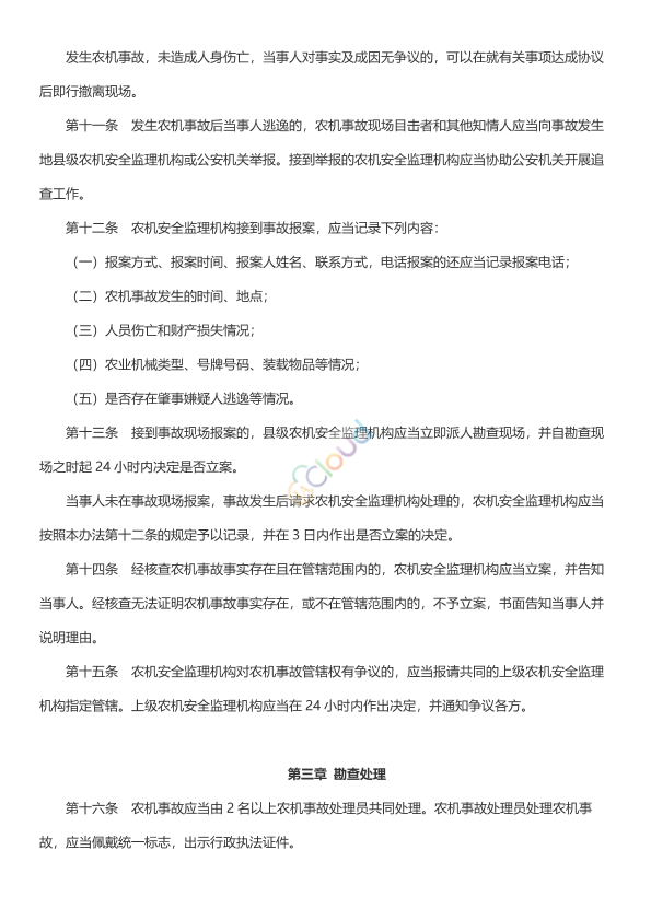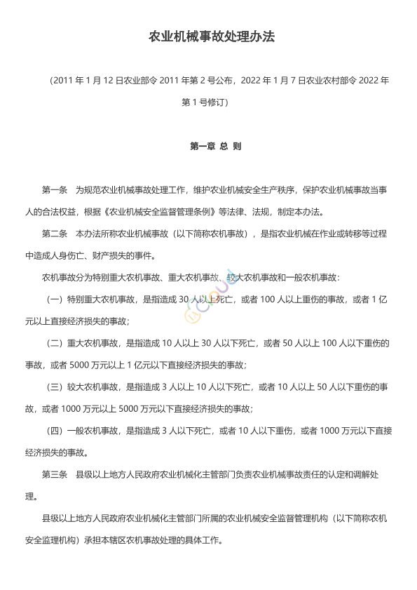 为规范农业机械事故处理工作,维护农业机械安全生产秩序,保护农业机械事故当事人的合法权益,根据《农业机械安全监督管理条例》等法律、法规,制定本办法。