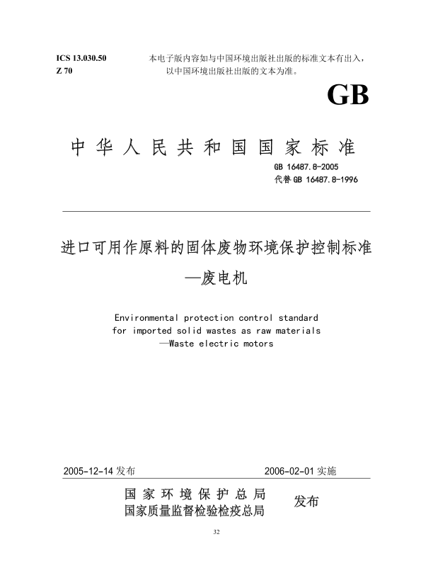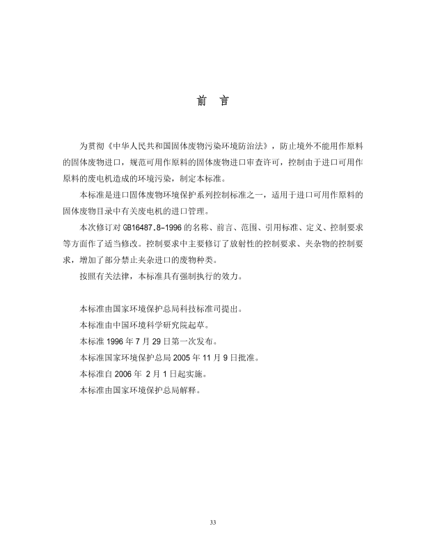 为贯彻《中华人民共和国固体废物污染环境防治法》,防止境外不能用作原料 的固体废物进口,规范可用作原料的固体废物进口审查许可,控制由于进口可用作 原料的废电机造成的环境污染,制定本标准。 本标准是进口固体废物环境保护系列控制标准之一,适用于进口可用作原料的 固体废物目录中有关废电机的进口管理。 本次修订对 GB16487.8-1996 的名称、前言、范围、引用标准、定义、控制要求 等方面作了适当修改。控制要求中主要修订了放射性的控制要求、夹杂物的控制要 求,增加了部分禁止夹杂进口的废物种类。 按照有关法律,本标准具有强制执行的效力。 本标准由国家环境保护总局科技标准司提出。 本标准由中国环境科学研究院起草。 本标准 1996 年7 月29 日第一次发布。 本标准国家环境保护总局 2005 年11 月9 日批准。 本标准自 2006 年 2 月1 日起实施。 本标准由国家环境保护总局解释。