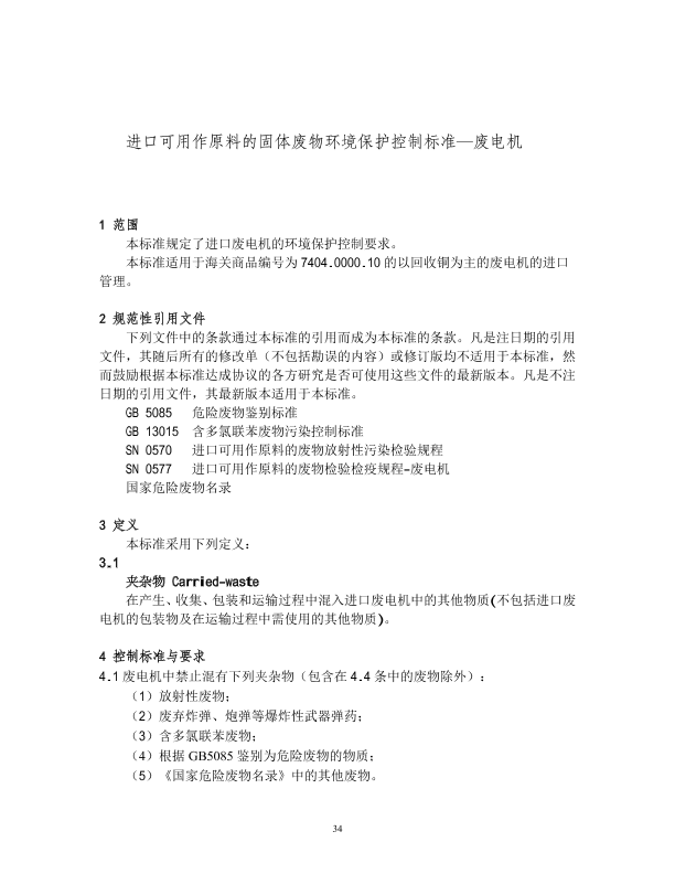 本标准规定了进口废电机的环境保护控制要求。 本标准适用于海关商品编号为 7404.0000.10 的以回收铜为主的废电机的进口 管理。