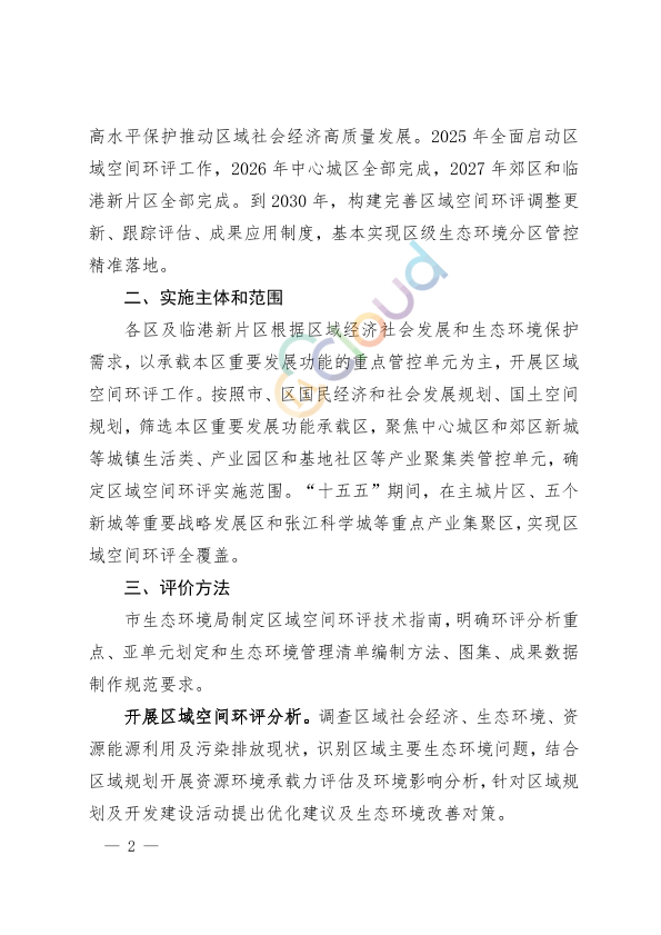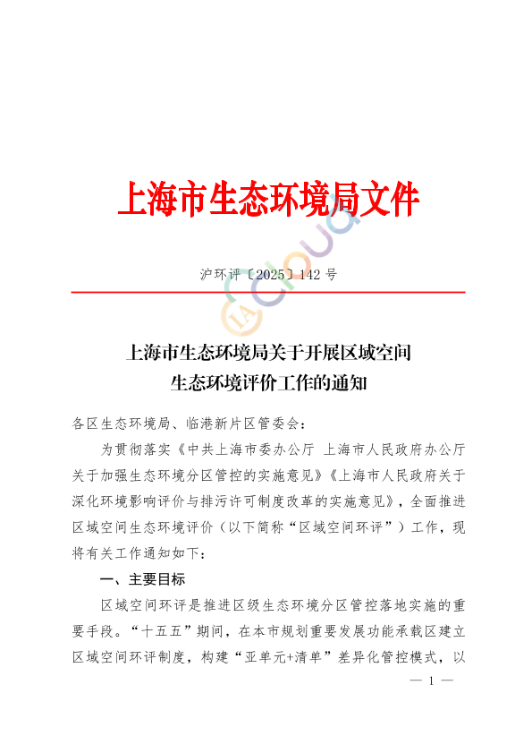 各区生态环境局、临港新片区管委会: 贯彻落实《中共上海市委办公厅 上海市人民政府办公厅关于加强生态环境分区管控的实施意见》《上海市人民政府关于深化环境影响评价与排污许可制度改革的实施意见》,全面推进区域空间生态环境评价(以下简称“区域空间环评”)工作,现将有关工作通知如下: