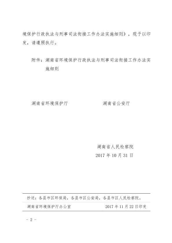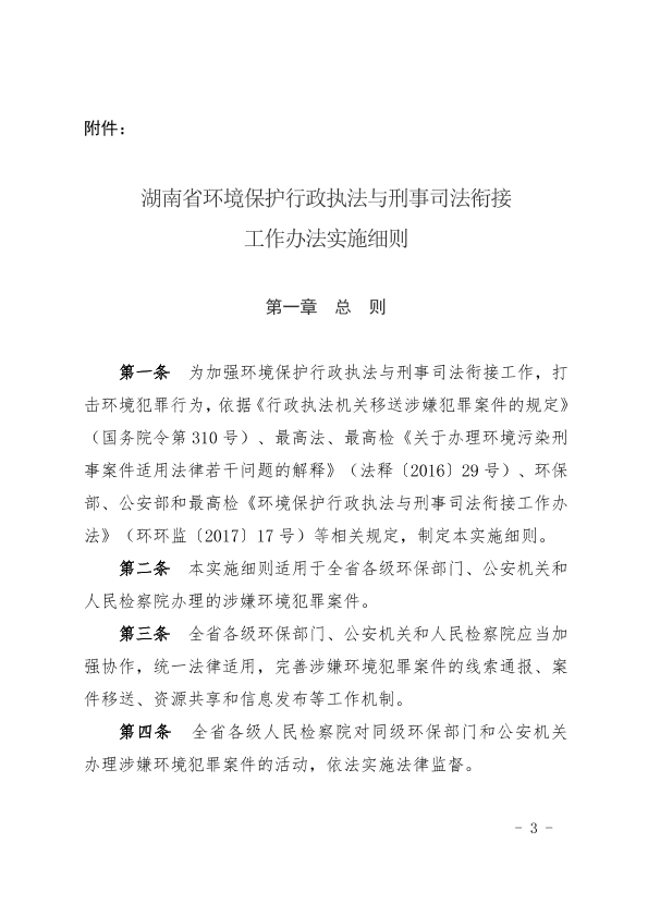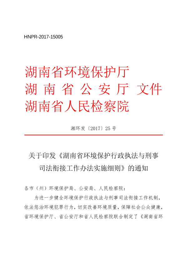 各市(州)环境保护局、公安局、人民检察院: 为进一步健全环境保护行政执法与刑事司法衔接工作机制,依法惩治环境犯罪行为,切实改善环境质量,保障社会公众健康,省环境保护厅、省公安厅和省人民检察院联合制定了《湖南省环境保护行政执法与刑事司法衔接工作办法实施细则》,现予以印发,请遵照执行。 附件:湖南省环境保护行政执法与刑事司法衔接工作办法实施细则 湖南省环境保护厅 湖南省公安厅 湖南省人民检察院 2017年10月31日