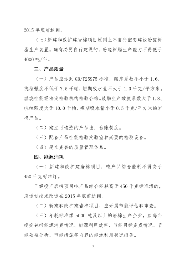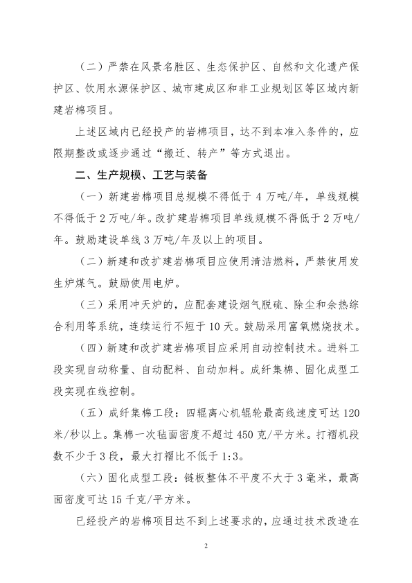 一、建设条件和生产布局 (一)新建和改扩建岩棉项目必须符合国家产业政策和产业规划,统筹资源、能源、环境、物流和市场等因素,合理布局。新建岩棉项目选址必须符合土地利用总体规划、土地供应政策和土地使用标准的规定。 (二)严禁在风景名胜区、生态保护区、自然和文化遗产保护区、饮用水源保护区、城市建成区和非工业规划区等区域内新建岩棉项目。 上述区域内已经投产的岩棉项目,达不到本准入条件的,应限期整改或逐步通过“搬迁、转产”等方式退出。 二、生产规模、工艺与装备 (一)新建岩棉项目总规模不得低于4万吨/年,单线规模不得低于2万吨/年。改扩建岩棉项目单线规模不得低于2万吨/年。鼓励建设单线3万吨/年及以上的项目。 (二)新建和改扩建岩棉项目应使用清洁燃料,严禁使用发生炉煤气。鼓励使用电炉。 (三)采用冲天炉的,应配套建设烟气脱硫、除尘和余热综合利用等系统,连续运行不短于10天。鼓励采用富氧燃烧技术。 (四)新建和改扩建岩棉项目应采用自动控制技术。进料工段实现自动称量、自动配料、自动加料。成纤集棉、固化成型工段实现在线控制。 (五)成纤集棉工段:四辊离心机辊轮最高线速度可达120米/秒以上。集棉一次毡面密度不超过450克/平方米。打褶机段数不少于3段,最大打褶比不低于1:3。 (六)固化成型工段:链板整体不平度不大于3毫米,最高面密度可达15千克/平方米。 已经投产的岩棉项目达不到上述要求的,应通过技术改造在2015年底前达到。 (七)新建和改扩建岩棉项目原则上不自行配套建设酚醛树脂生产装置。确有必要自行建设的,酚醛树脂生产能力不得低于4000吨/年。 三、产品质量 (一)产品应达到GB/T25975标准,酸度系数不小于1.6,抗拉强度不低于7.5千帕,短期吸水量不大于1.0千克/平方米。燃烧性能经法定检验机构检验合格。鼓励生产酸度系数大于1.8、抗拉强度大于10.0千帕、短期吸水量小于0.5千克/平方米的岩棉产品。 (二)建立可追溯的产品出厂台账制度。 (三)配备产品性能检验实验室和必要的检测设备。 (四)建立完善的质量管理体系。 四、能源消耗 {C}(二)�{C}(一)新建和改扩建岩棉项目,吨产品综合能耗不得高于450千克标准煤。 已经投产岩棉项目吨产品综合能耗高于450千克标准煤的,应通过技术改造在2015年底前达到。 (二)新建和改扩建岩棉项目,应开展节能评估和审查。 (三)年耗标准煤5000吨及以上的岩棉生产企业,应每年提交包括能源消费情况、能源利用效率、节能目标完成情况、节能效益分析、节能措施等内容的能源利用状况报告。 五、环境保护与综合利用 (一)含尘气体收集治理,达标排放。烟气经脱硫除尘等处理后,排放的废气应符合GB9078《工业窑炉大气污染物排放标准》、GB16297《大气污染综合排放标准》或项目所在地环境标准要求。鼓励新建和改扩建岩棉项目配置污染源监测设施并开展自行监测,预留烟气脱硝设施场地、配置烟气脱硝装置。 (二)生产用水循环利用,外排废水达到GB8978《污水综合排放标准》或项目所在地环境标准要求。 (三)生产过程中产生的废棉回收再利用。 (四)完善噪声防治措施,厂界噪声达到GB12348《工业企业厂界噪声排放标准》要求。 (五)配套建设的环境保护设施与主体工程同时设计、同时施工、同时投入使用。 (六)开展清洁生产审核,建立环境管理体系。制定完善的突发环境事件应急预案。 六、安全生产、职业卫生和社会责任 (一)建立健全安全生产、职业病危害防治制度,配备符合规定的安全生产和职业病防护设施。 (二)新建和改扩建岩棉项目的安全生产和职业病防护设 施,与主体工程同时设计、同时施工、同时投入使用。 {C}(三){C}有矿山的企业、自行配套建设酚醛树脂生产装置的企业,要取得相应的安全生产许可。 (四)不拖欠职工工资,按规定足额缴纳养老保险、医疗保险、工伤保险、失业保险、生育保险费和住房公积金。 (五)建立职业健康安全管理体系。 七、监督管理 (一)新建和改扩建岩棉项目必须符合本准入条件。项目的投资、土地供应、环评审批等管理应当依据本准入条件。对不符合本准入条件的,有关部门不予办理项目建设相关手续、不新增授信支持。 (二)项目应获得投资、土地、环保、安全、信贷等有效认可或批复后方可开工建设。项目建设要由有资质的单位设计和施工。项目投产前,要经省级工业、投资、国土、环保、安全监管等行政部门按照本准入条件及相关规定进行监督检查。经检查不符合本准入条件的,应责令整改,不得投入试生产。 (三)各级工业和环保、质检、安全监管等部门检查辖区内岩棉生产企业执行本准入条件的情况。工业和信息化部公告符合本准入条件的岩棉生产企业名单,接受社会监督并实行动态管理。公告管理办法由工业和信息化部另行制定。政府采购应选择符合本准入条件的企业生产的产品。 八、附则 (一)本准入条件适用于中华人民共和国境内(台湾、香港、澳门地区除外)所有的岩棉生产企业。 (二)矿渣棉生产企业,除产品质量执行GB/T11835《绝热用岩棉、矿渣棉及其制品》、GB/T19686《建筑用岩棉、矿渣棉绝热制品》外,其他应按照本准入条件执行。 (三)本准入条件引用的法律法规、标准规范和产业政策,凡是不注日期的,按其最新版本执行。 (四)本准入条件自发布之日起实施,由工业