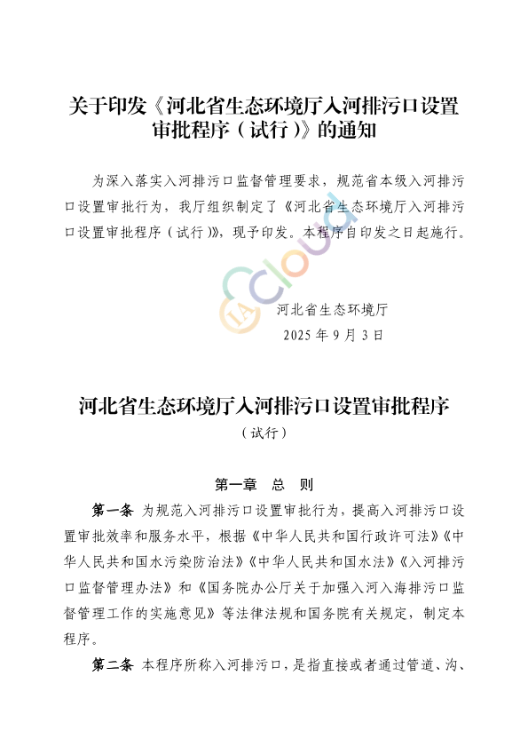 为深入落实入河排污口监督管理要求,规范省本级入河排污口设置审批行为,我厅组织制定了《河北省生态环境厅入河排污口设置审批程序(试行)》,现予印发。 河北省生态环境厅 2025年9月3日