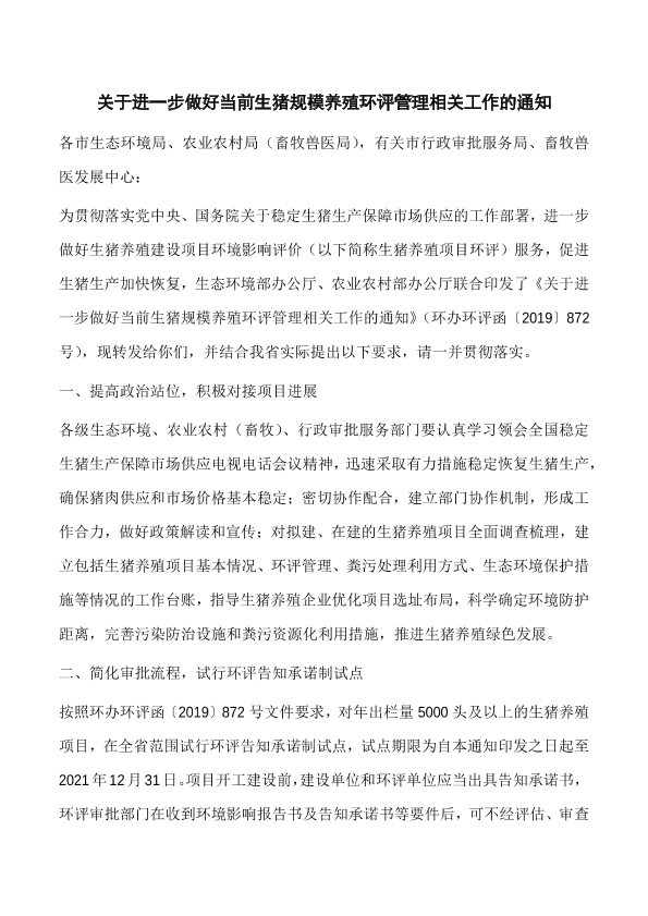 关于进一步做好当前生猪规模养殖环评管理相关工作的通知