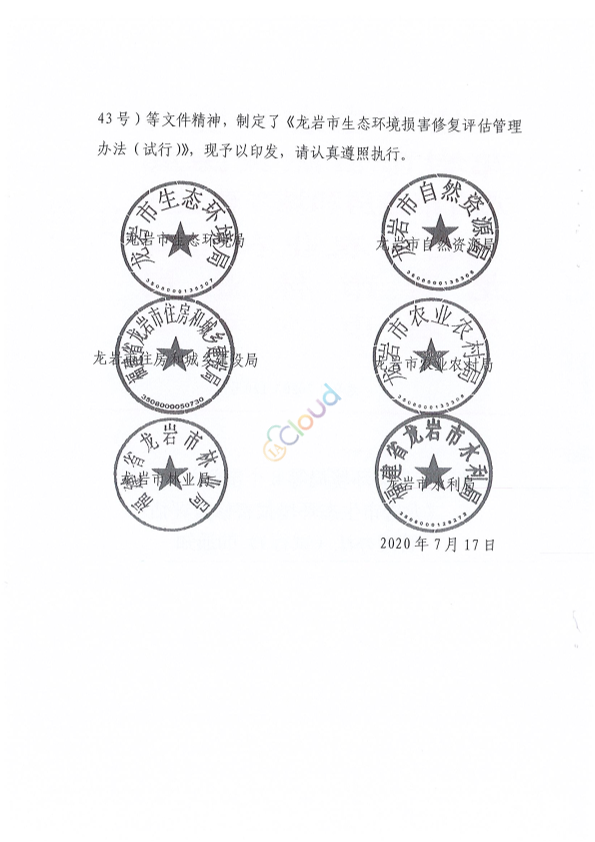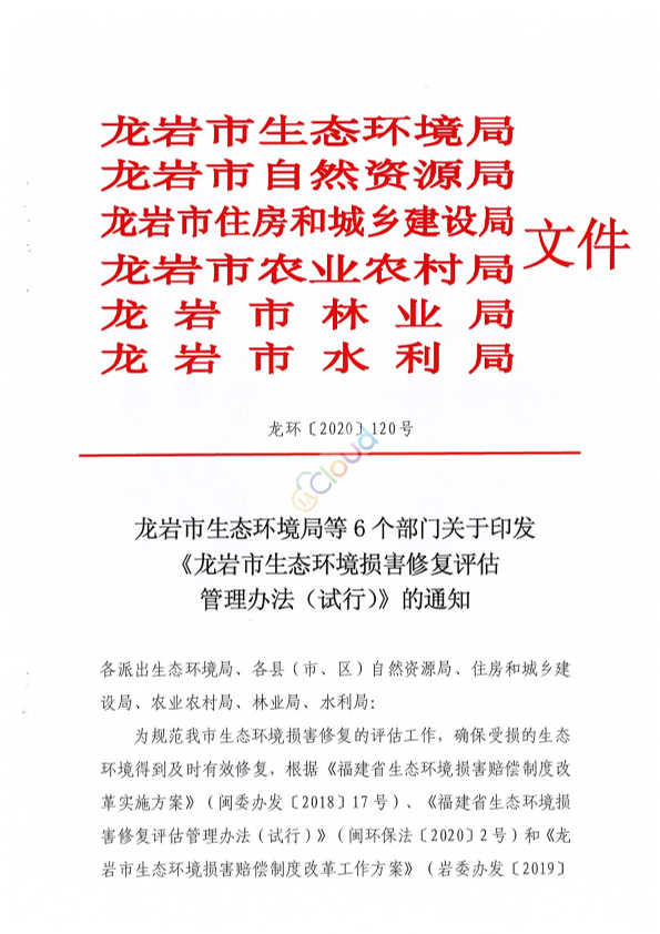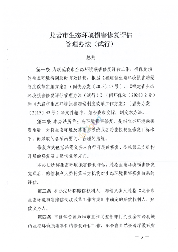 各派出生态环境局、各县(市、区)自然资源局、住房和城乡建设局、农业农村局、林业局、水利局: 为规范我市生态环境损害修复的评估工作,确保受损的生态环境得到及时有效修复,根据《福建省生态环境损害赔偿制度改革实施方案》(闽委办发[2018] 17号)、《福建省生态环境损害修复评估管理办法(试行)》( 闽环保法[2020] 2号)和《龙岩市生态环境损害赔偿制度改革工作方案》(岩委办发 [2019] 43号)等文件精神,制定了《龙岩市生态环境损害修复评估管理办法(试行)》,现予以印发,请认真遵照执行。
