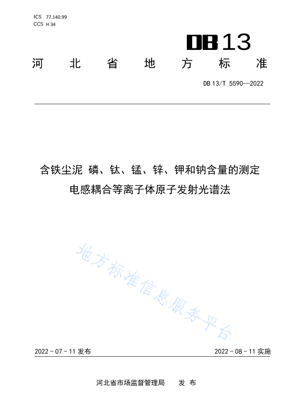本文件描述了用电感耦合等离子体原子发射光谱法测定含铁尘泥中磷、钛、锰、锌、钾和钠含量的方法。 本文件适用于含铁尘泥中磷、钛、锰、锌、钾和钠含量的测定,测定范围见表1。