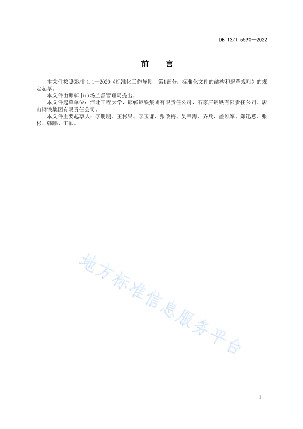 本文件按照GB/T 1.1- 2020《标准化工作导则第1部分: 标准化文件的结构和起草规则》的规定起草。 本文件由邯郸市市场监督管理局提出。 本文件起草单位:河北工程大学、邯郸钢铁集团有限责任公司、石家庄钢铁有限责任公司、唐山钢铁集团有限责任公司。 本文件主要起草人:李朋朋、王彬果、李玉谦、张改梅、吴章海、齐兵、盖领军、郑迅燕、张彬、韩鹏、王颖。