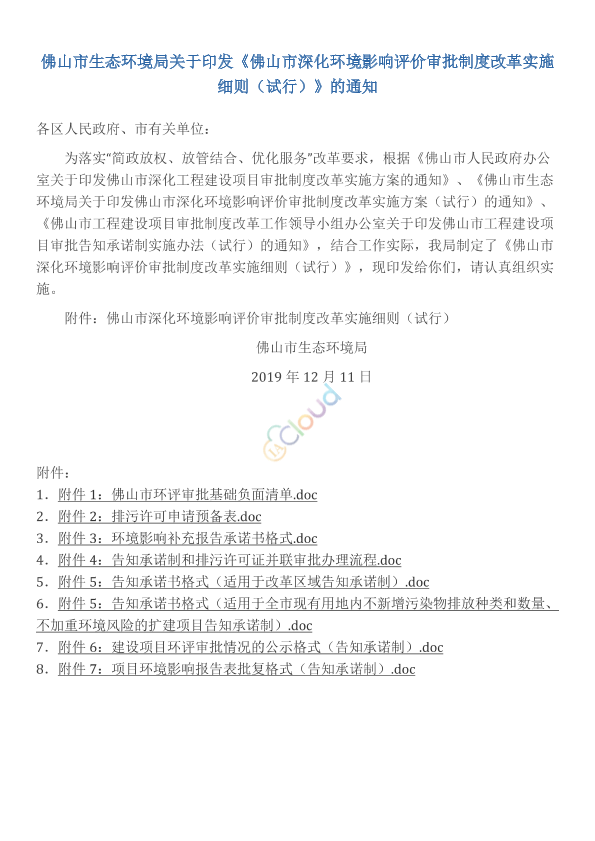 各区人民政府、市有关单位: 为落实“简政放权、放管结合、优化服务”改革要求,根据《佛山市人民政府办公室关于印发佛山市深化工程建设项目审批制度改革实施方案的通知》、《佛山市生态环境局关于印发佛山市深化环境影响评价审批制度改革实施方案(试行)的通知》、《佛山市工程建设项目审批制度改革工作领导小组办公室关于印发佛山市工程建设项目审批告知承诺制实施办法(试行)的通知》,结合工作实际,我局制定了《佛山市深化环境影响评价审批制度改革实施细则(试行)》,现印发给你们,请认真组织实施。 附件:佛山市深化环境影响评价审批制度改革实施细则(试行) 佛山市生态环境局 2019年12月11日 附件: 1.附件1:佛山市环评审批基础负面清单.doc 2.附件2:排污许可申请预备表.doc 3.附件3:环境影响补充报告承诺书格式.doc 4.附件4:告知承诺制和排污许可证并联审批办理流程.doc 5.附件5:告知承诺书格式(适用于改革区域告知承诺制).doc 6.附件5:告知承诺书格式(适用于全市现有用地内不新增污染物排放种类和数量、不加重环境风险的扩建项目告知承诺制).doc 7.附件6:建设项目环评审批情况的公示格式(告知承诺制).doc