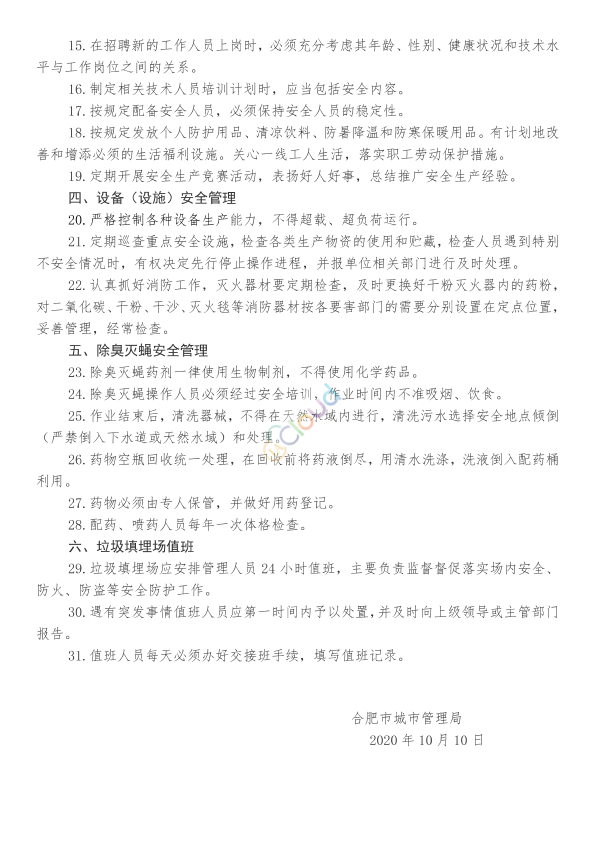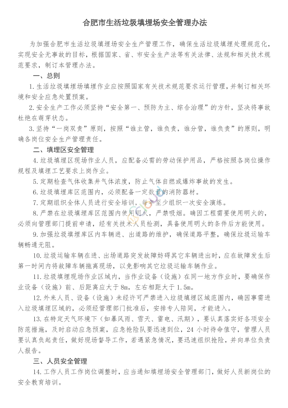 为加强合肥市生活垃圾填埋场安全生产管理工作,确保生活垃圾填埋处理规范化,实现安全无事故的目标,根据国家、省、市安全生产法等有关法律、法规和相关技术规范要求,制订本管理办法。