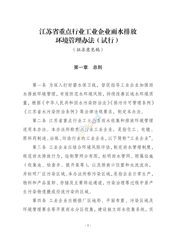 为深入打好碧水保卫战,督促指导工业企业加强雨水排放环境管理,有效防范水环境风险,持续改善区域水环境质量,我厅依据《中华人民共和国水污染防治法》《江苏省水污染防治条例》《排污许可管理条例》等文件,组织制订了《江苏省重点行业工业企业雨水排放环境管理办法(试行)》(征求意见稿)。现面向社会公开征求意见和建议,有关单位和社会各界人士可于12月3日前将意见反馈至联系人邮箱。 附件:1江苏省重点行业工业企业雨水排放环境管理办法(试行)(征求意见稿).pdf 2江苏省重点行业工业企业雨水排放环境管理办法(试行)编制说明.pdf 江苏省生态环境厅 2022年11月3日 (联系人:陆一维,电话:18094215183,邮箱:onedimension@126.com; 邢学珂,电话:025-86266200,邮箱:lyc@jshb.gov.cn)