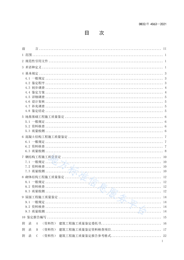 本标准规定了建筑工程施工质量鉴定的基本规定和地基基础工程、混凝土结构工程、钢结构工程、砌体结构工程、屋面工程施工质量鉴定的内容。 本标准适用于江苏省行政区域内处于施工过程中或施工完成后未进行竣工验收的建筑工程施工质量鉴定。对施工质量有争议的建筑工程施工质量鉴定可参照本标准执行。