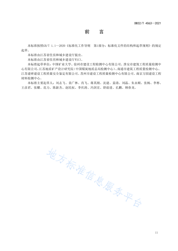 本标准按照GB/T 1.1- -2020《标准化工作导则第1部分: 标准化文件的结构和起草规则》的规定起草。 本标准由江苏省住房和城乡建设厅提出。 本标准由江苏省住房和城乡建设厅归口。 本标准起草单位:中国矿业大学、徐州市建设工程检测中心有限公司、淮安市建筑工程质量检测中心有限公司、江苏地质矿产设计研究院(中国煤炭地质总局检测中心)、南通市建筑工程质量检测中心、江苏建研建设工程质量安全鉴定有限公司、苏州市建设工程质量检测中心有限公司、南京方园建设工程材料检测中心。 本标准主要起草人:刘志飞、袁广林、肖飞、蒋其刚、沈建、姜涛、刘磊、朱永顺、张杨、李彬、王彦君、张耀、范力、陈新杰、赵民权、李庆涛、冯剑宏、舒前进、孔鹏、顾春龙。