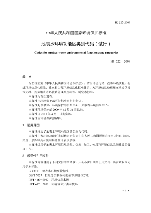 本标准规定了地表水环境功能区的类别与代码。 本标准中水环境功能区类别代码对象为中华人民共和国领域内江河、湖泊、运河、渠道、水库等具有使用功能的地表水水域。 本标准适用于地表水环境信息采集、交换、加工、使用和环境信息系统建设的管理工作。