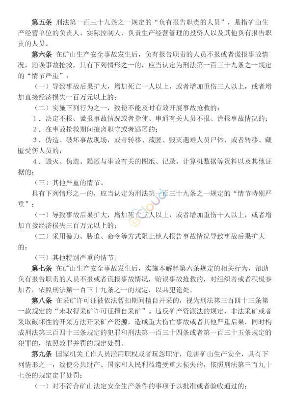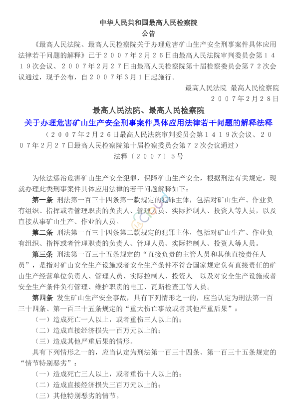 《最高人民法院、最高人民检察院关于办理危害矿山生产安全刑事案件具体应用法律若干问题的解释》已于2007年2月26日由最高人民法院审判委员会第1419次会议、2007年2月27日由最高人民检察院第十届检察委员会第72次会议通过,现予公布,自2007年3月1日起施行。 最高人民法院 最高人民检察院 2007年2月28日
