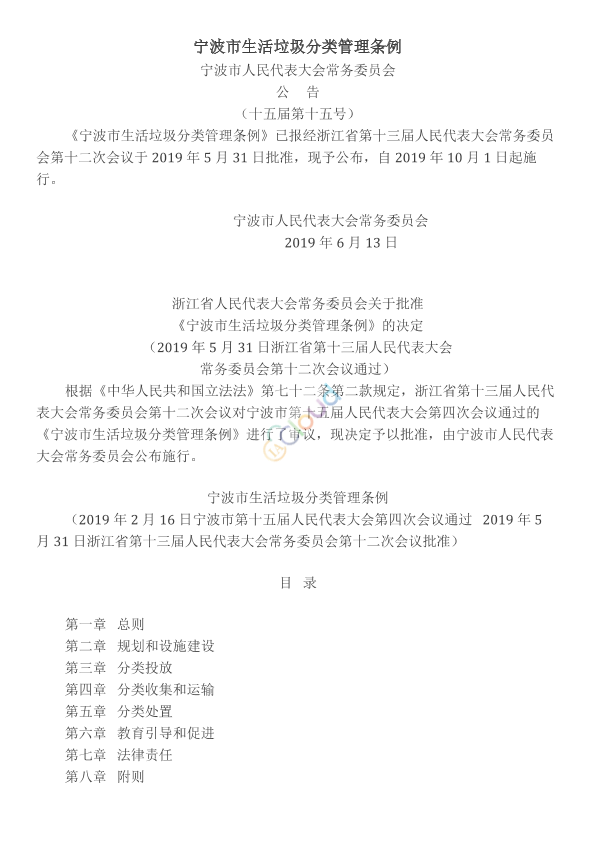 宁波市人民代表大会常务委员会 公 告 (十五届第十五号) 《宁波市生活垃圾分类管理条例》已报经浙江省第十三届人民代表大会常务委员会第十二次会议于2019年5月31日批准,现予公布,自2019年10月1日起施行。 宁波市人民代表大会常务委员会 2019年6月13日