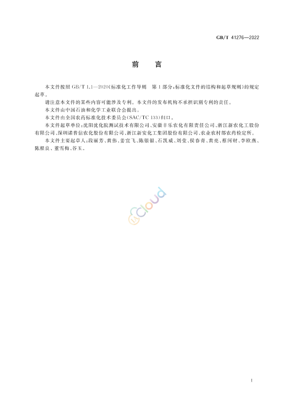 本文件按照GB/T1.1--2020《标准化工作导则第1部分:标准化文件的结构和起草规则》的规定起草。 请注意本文件的某些内容可能涉及专利。本文件的发布机构不承担识别专利的责任。 本文件由中国石油和化学工业联合会提出。 本文件由全国农药标准化技术委员会(SAC/TC133)归口。 本文件起草单位;沈阳沈化院测试技术有限公司、安徽丰乐农化有限责任公司、浙江新农化工股份有限公司、深圳诺普信农化股份有限公司、浙江新安化工集团股份有限公司、农业农村部农药检定所。 本文件主要起草人:段丽芳、黄伟、姜宜飞、陈银银、石凯威、刘莹、侯春青、黄亮、絷河财、李欧燕、陈根良、董雪梅、谷玉。