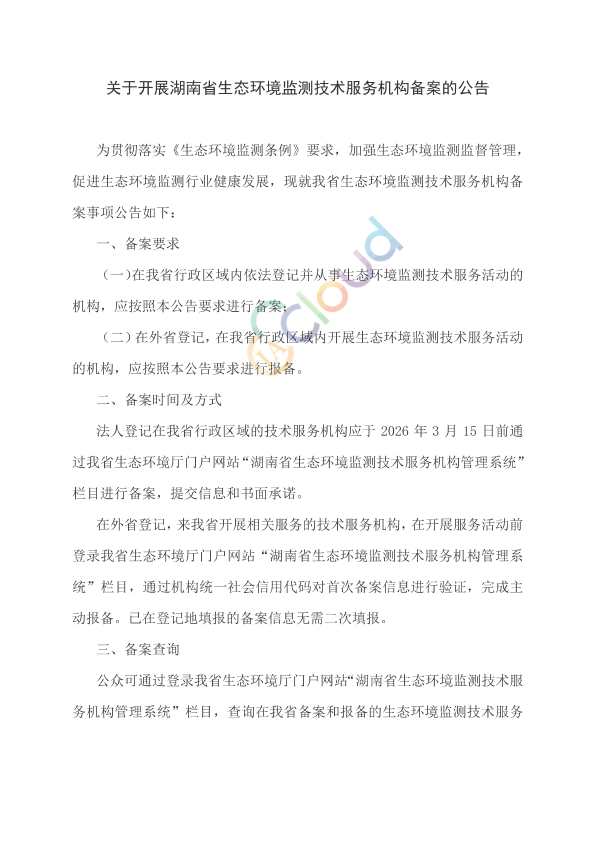 为贯彻落实《生态环境监测条例》要求,加强生态环境监测监督管理,促进生态环境监测行业健康发展,现就我省生态环境监测技术服务机构备案事项公告如下: