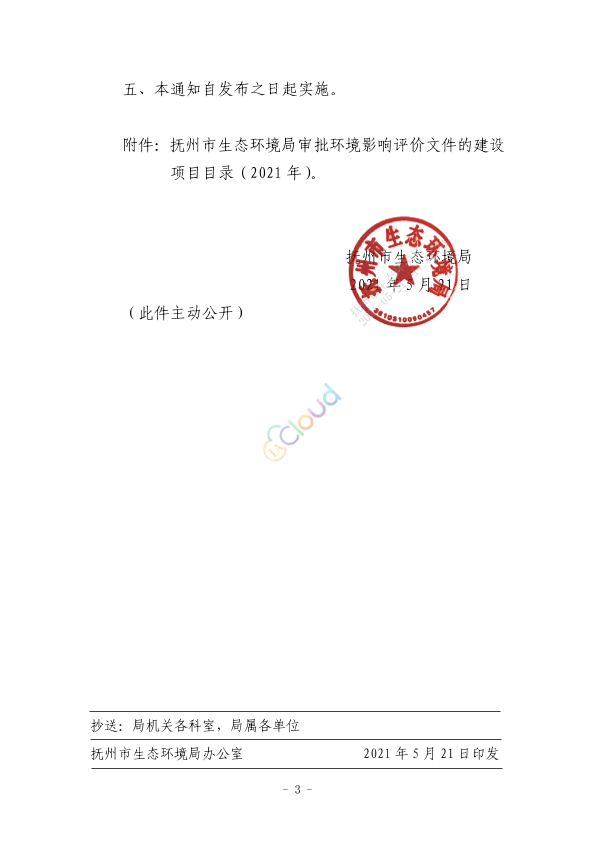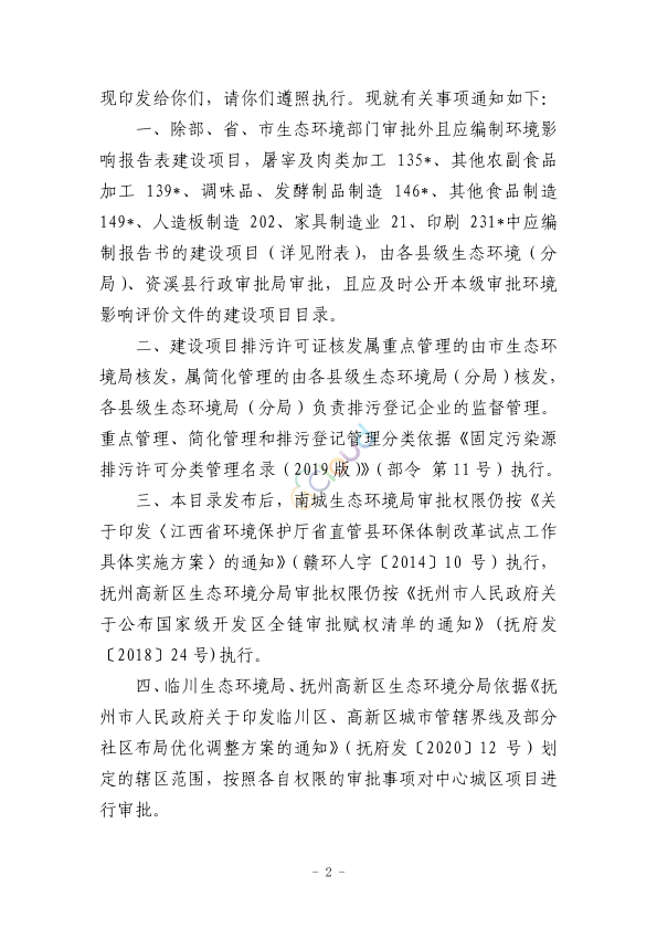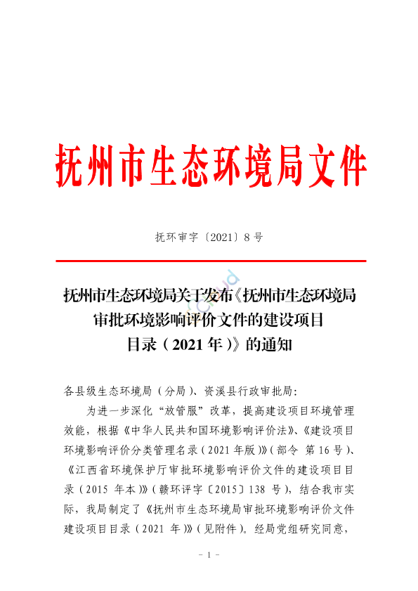 各县级生态环境局(分局)、资溪县行政审批局: 为进一步深化“放管服”改革,提高建设项目环境管理效能,根据《中华人民共和国环境影响评价法》、《建设项目环境影响评价分类管理名录(2021 年版)》(部令 第 16 号)、《江西省环境保护厅审批环境影响评价文件的建设项目目录(2015 年本)》(赣环评字〔2015〕138 号),结合我市实际,我局制定了《抚州市生态环境局审批环境影响评价文件建设项目目录(2021 年)》(见附件)。经局党组研究同意,现印发给你们,请你们遵照执行。现就有关事项通知如下: 一、除部、省、市生态环境部门审批外且应编制环境影响报告表建设项目,屠宰及肉类加工 135*、其他农副食品加工 139*、调味品、发酵制品制造 146*、其他食品制造149*、人造板制造 202、家具制造业 21、印刷 231*中应编制报告书的建设项目(详见附表),由各县级生态环境(分局)、资溪县行政审批局审批,且应及时公开本级审批环境影响评价文件的建设项目目录。 二、建设项目排污许可证核发属重点管理的由市生态环境局核发,属简化管理的由各县级生态环境局(分局)核发,各县级生态环境局(分局)负责排污登记企业的监督管理。重点管理、简化管理和排污登记管理分类依据《固定污染源排污许可分类管理名录(2019 版)》(部令 第 11 号)执行。 三、本目录发布后,南城生态环境局审批权限仍按《关于印发〈江西省环境保护厅省直管县环保体制改革试点工作具体实施方案〉的通知》(赣环人字〔2014〕10 号)执行,抚州高新区生态环境分局审批权限仍按《抚州市人民政府关于公布国家级开发区全链审批赋权清单的通知》(抚府发〔2018〕24 号)执行。 四、临川生态环境局、抚州高新区生态环境分局依据《抚州市人民政府关于印发临川区、高新区城市管辖界线及部分社区布局优化调整方案的通知》(抚府发〔2020〕12 号)划定的辖区范围,按照各自权限的审批事项对中心城区项目进行审批。 五、本通知自发布之日起实施。 附件:抚州市生态环境局审批环境影响评价文件的建设项目目录(2021 年)。 抚州市生态环境局 2021年 5 月 21 日