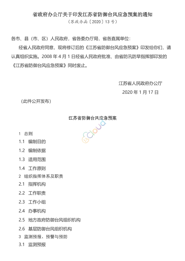 各市、县(市、区)人民政府,省各委办厅局,省各直属单位: 经省人民政府同意,现将修订后的《江苏省防御台风应急预案》印发给你们,请认真组织实施。2008年4月1日经省人民政府批准、由省防汛防旱指挥部印发的《江苏省防御台风应急预案》同时废止。 江苏省人民政府办公厅 2020年1月17日