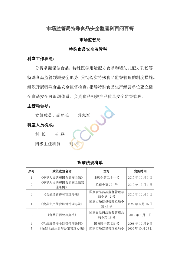 科室工作职能: 分析掌握保健食品,特殊医学用途配方食品和婴幼儿配方乳粉等特殊食品监管领域安全形势,贯彻落实特殊食品监督管理的制度措施。组织开展特殊食品安全监督检查,指导特殊食品生产经营单位建立健全食品安全可追溯体系。负责食品相关产品质量安全监督管理。 主管局领导: 党组成员、副局长 盛志军 科室人员构成: 科 长 王 磊 四级主任科员 刘 江