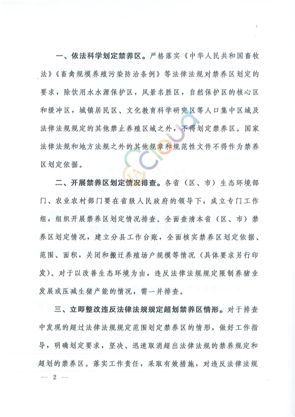 受非洲猪瘟疫情冲击,当前我国生猪存栏下降,产能下滑,稳产保供形势严峻。为贯彻落实党中央、国务院决策部署,按照全国稳定生猪生产保障市场供应电视电话会议精神,进一步规范畜禽养殖禁养区划定和管理,促进生猪生产发展,现将有关要求通知如下。